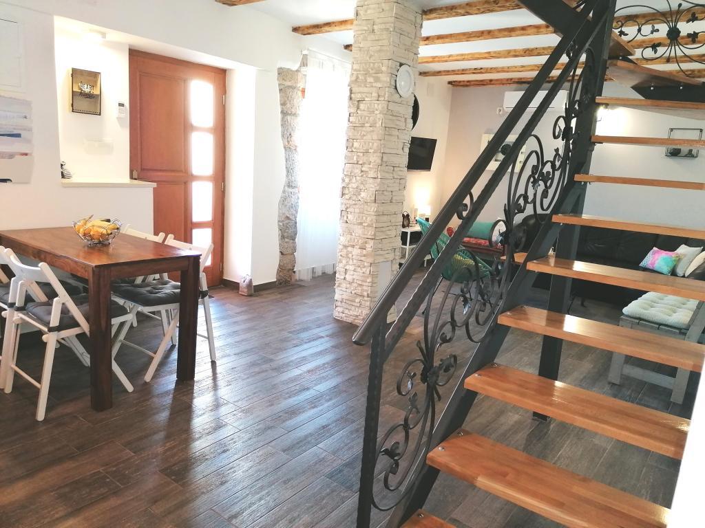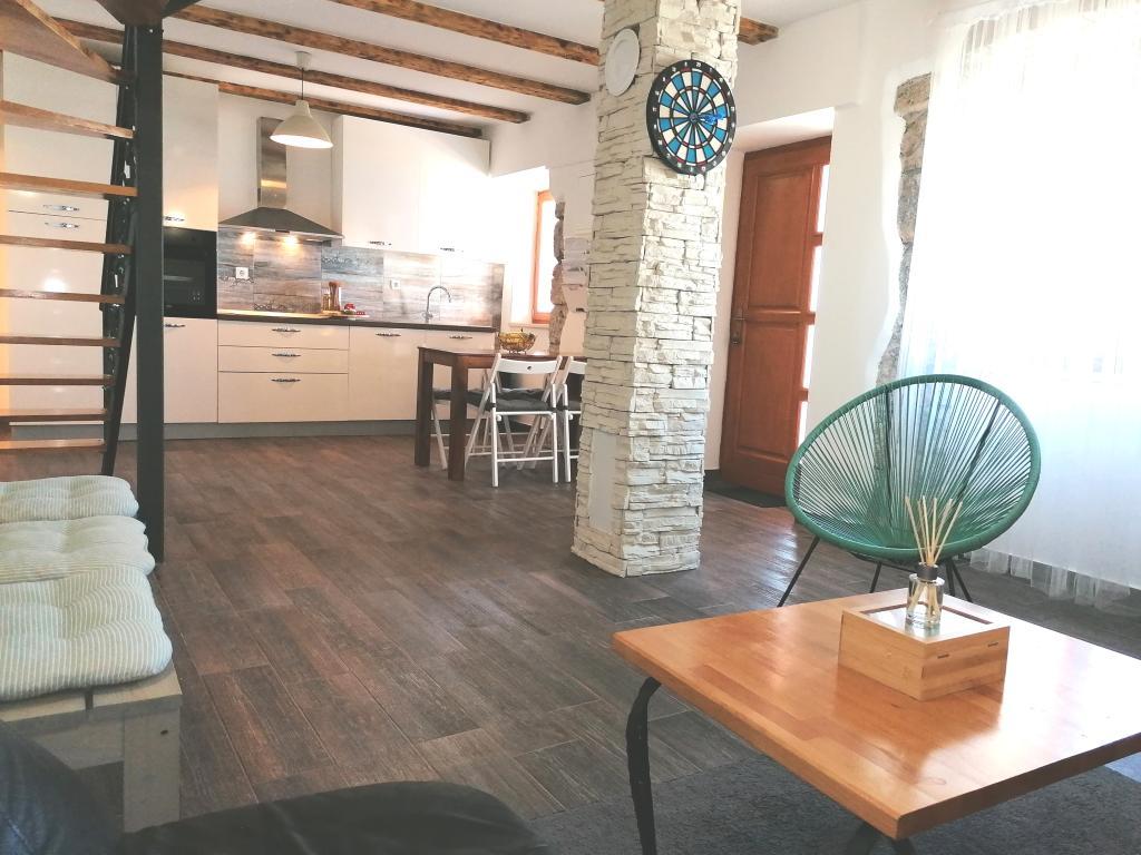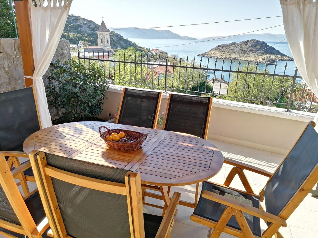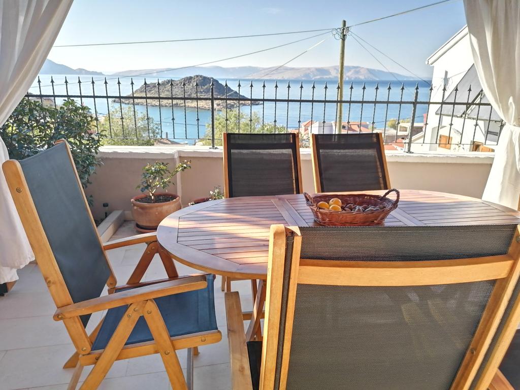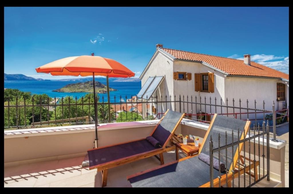 Pristna obmorska počitniška hiša, urejena v stilu in z veliko pozornosti ter opremljena z vso sodobno opremo. Hiša je bila leta 2018 v celoti prenovljena. Gostom je na voljo celotna počitniška hiša, ki ima 2 spalnici z zakonsko posteljo in pomožnim ležiščem, 1 veliko kopalnico, kuhinjo z dnevno sobo in prostorno delno pokrito teraso z očarljivim pogledom na kristalno čisto morje in sosednje otoke (Krk in Prvić). V dnevni sobi je kotna sedežna garnitura. V stavbi lahko biva največ 6 oseb. Hiša je le nekaj minut hoje oddaljena od centra mesta, plaže in vseh ostalih vsebin (trgovina, restavracija, pošta, bankomat...).