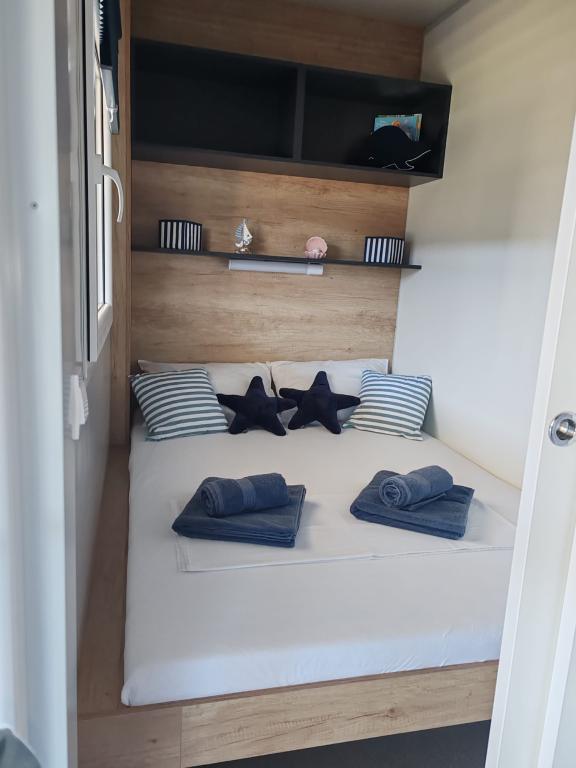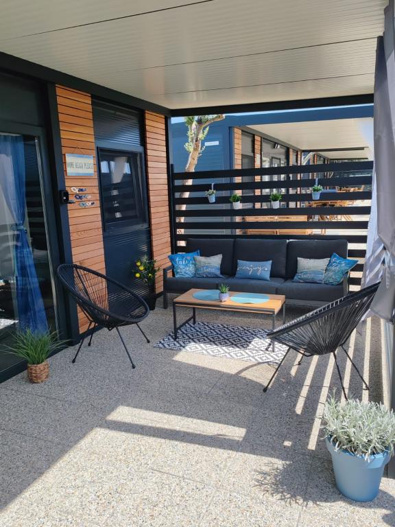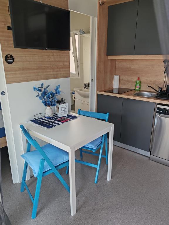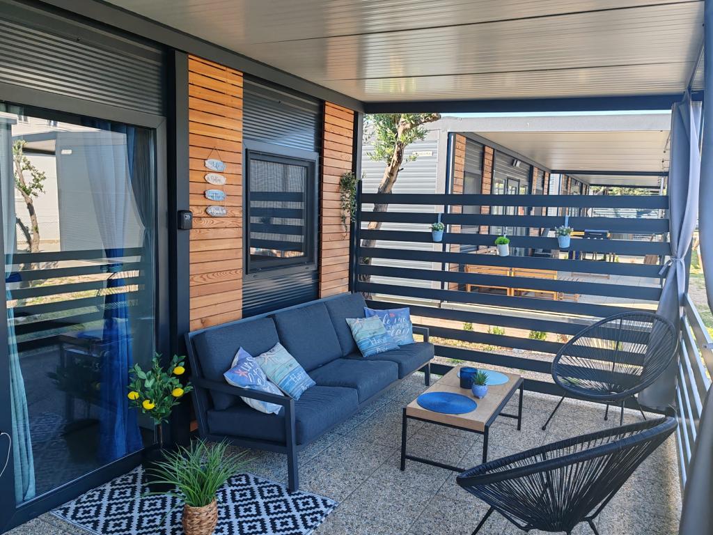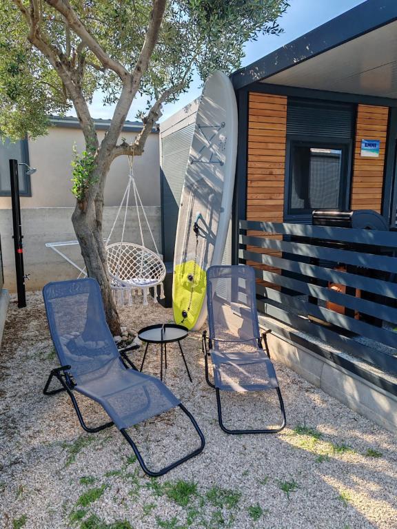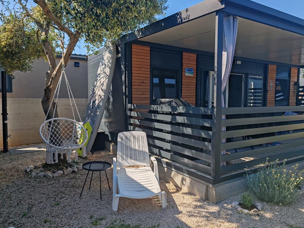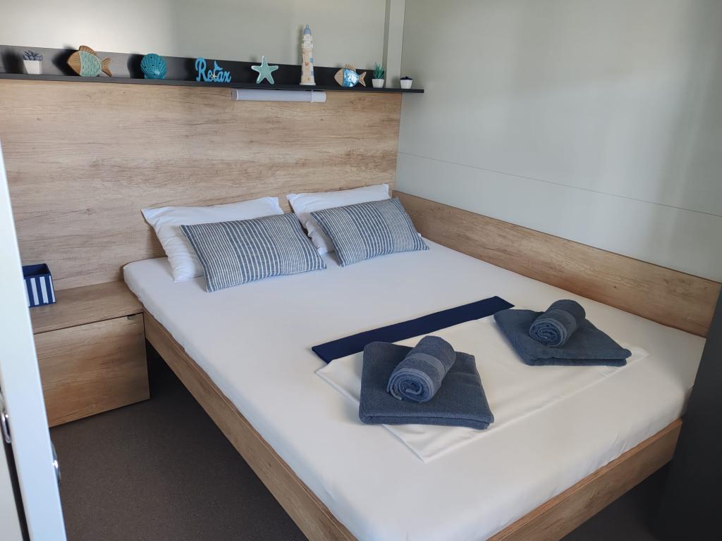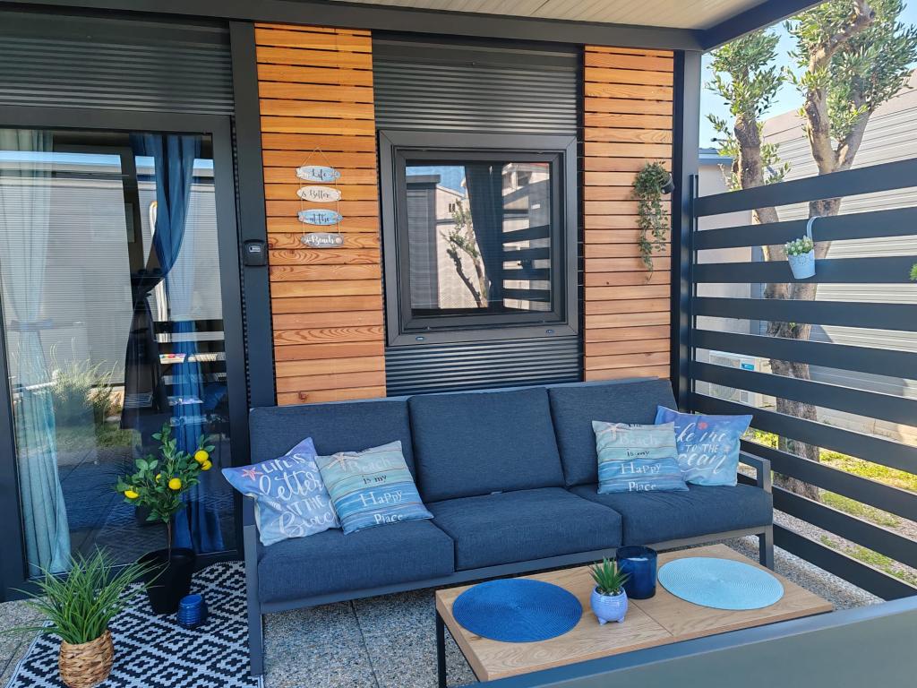 Nova popolnoma opremljena mobilna hišica se nahaja v prenovljenem kampu Tamaris. Hiša je v celoti opremljena z vsemi pripomočki za prijeten dopust. Prednost hiše je bližina čudovite plaže, ki je oddaljena le 15 metrov. Opis hiše: -2 spalnici z zakonskimi posteljami (140x200 in 160x200) in posteljnino -kuhinja z dnevno sobo (raztegljiva miza, raztegljiv kavč) -kopalnica (brisače in sušilnik za lase) -velika prostorna terasa (miza + 6 stolov, pohištvo in stoli za sedenje, plinski žar z dodatnim gorilnikom za kuhanje)