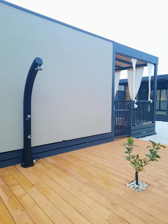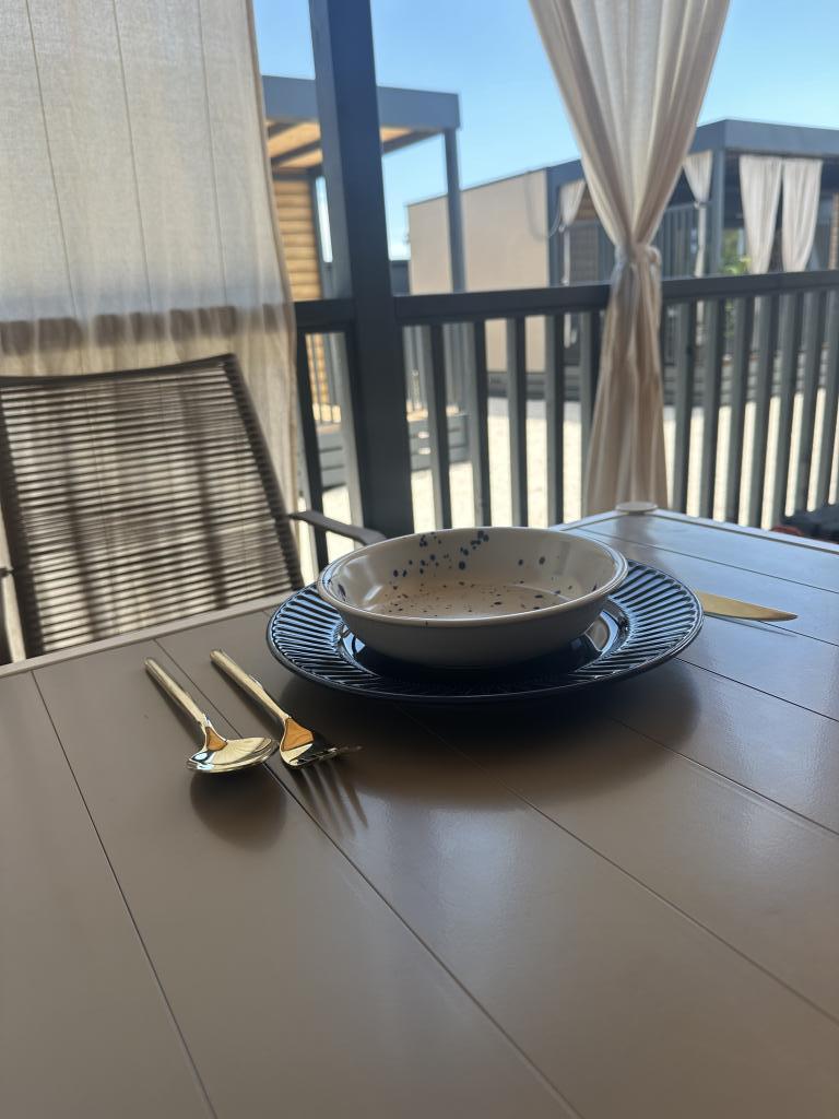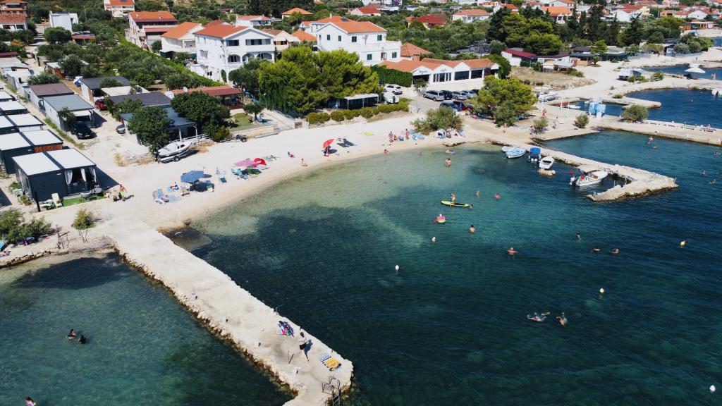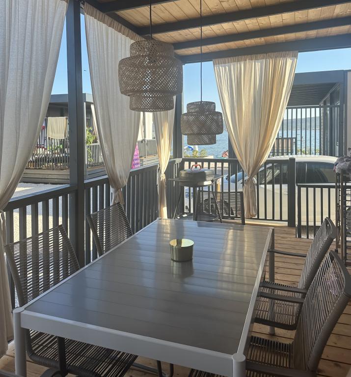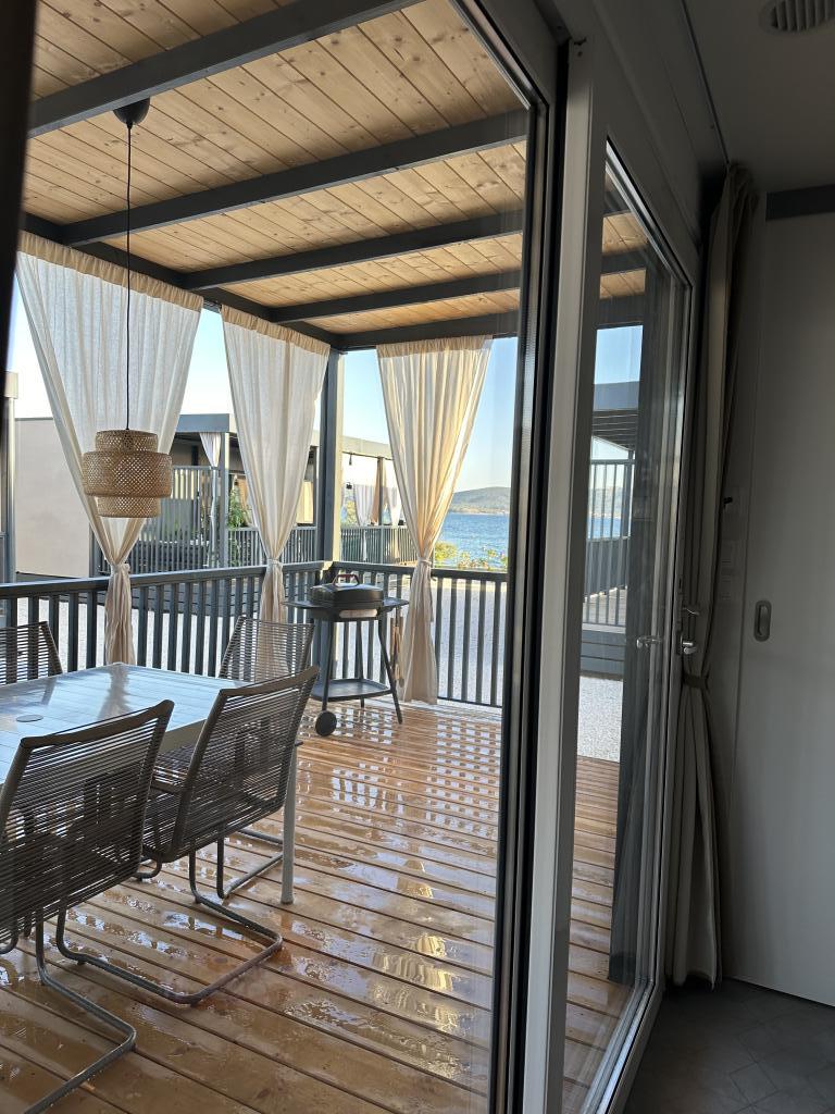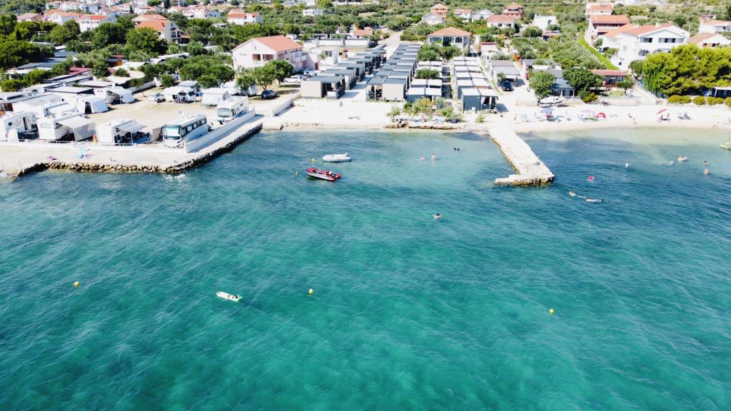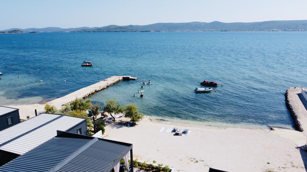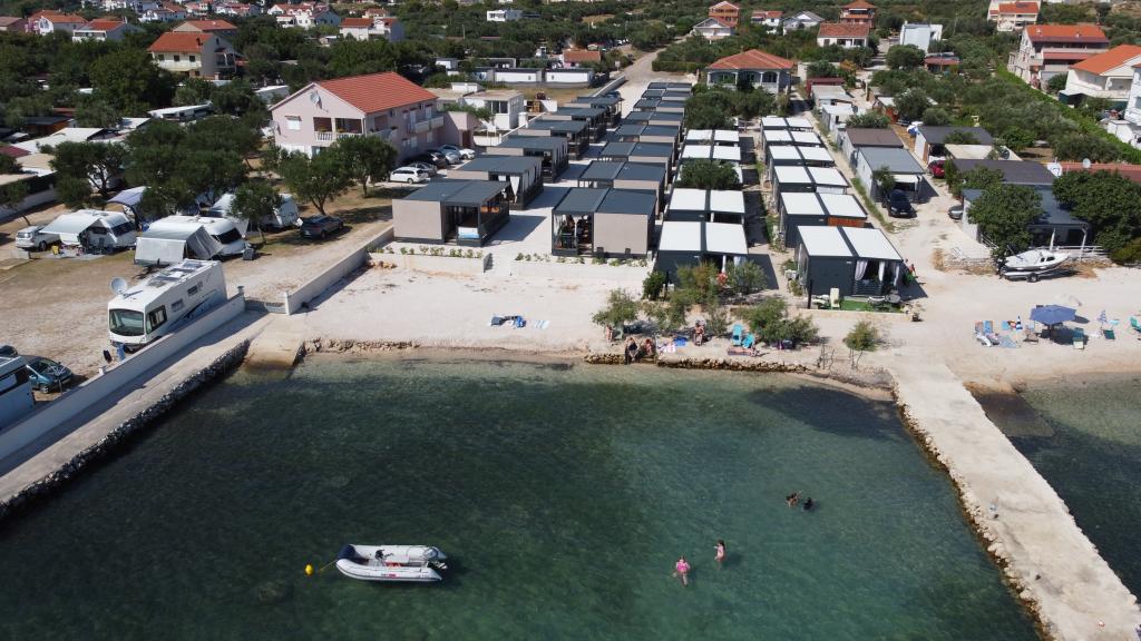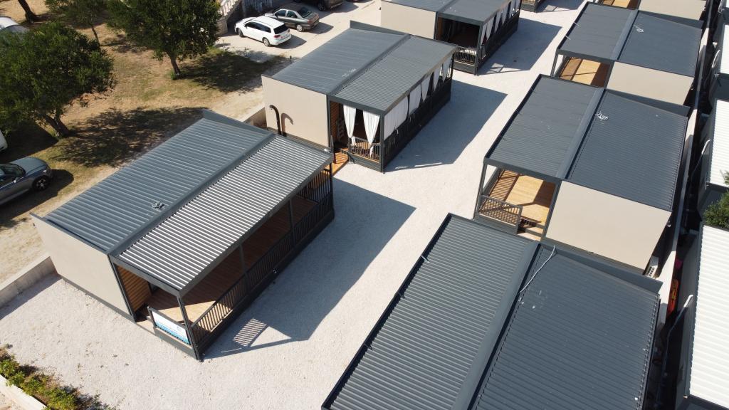Popolnoma in moderno opremljena mobilna hišica se nahaja v mirnem, manjšem kampu, le nekaj korakov od plaže. Ob čudovitem pogledu na morje lahko uživate na terasi na ležalnikih ali na ležalnikih druge terase, ob rahlem vetriču. Sestavljen je iz 2 spalnic, 2 kopalnic, kuhinje, dnevne sobe z raztegljivim kavčem. Objekt se nahaja 10 minut hoje ob obali od centra, trgovin, pekarn, restavracij, kavarn. Prva restavracija je oddaljena 2 minuti hoje.