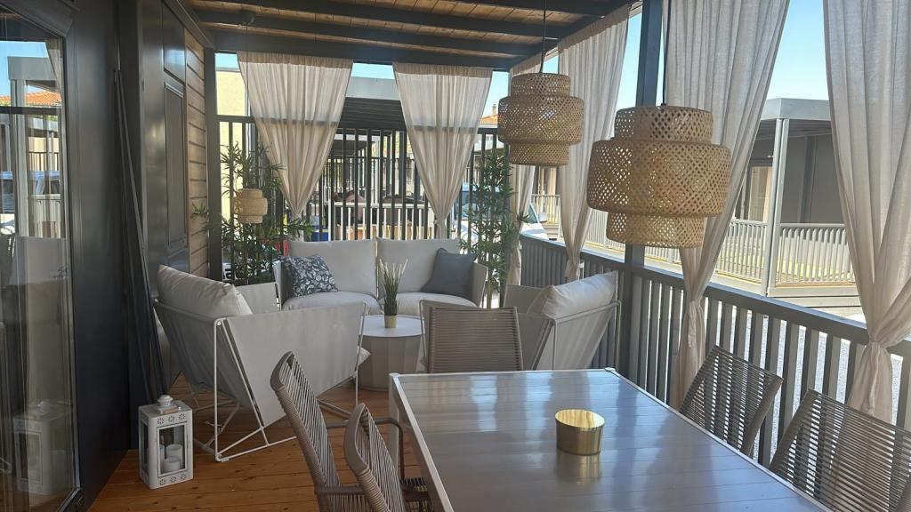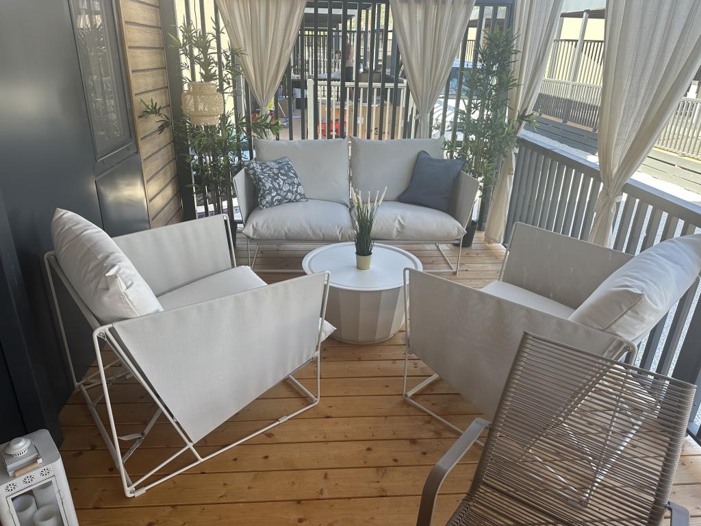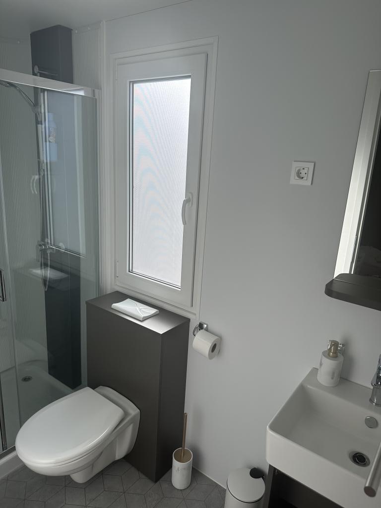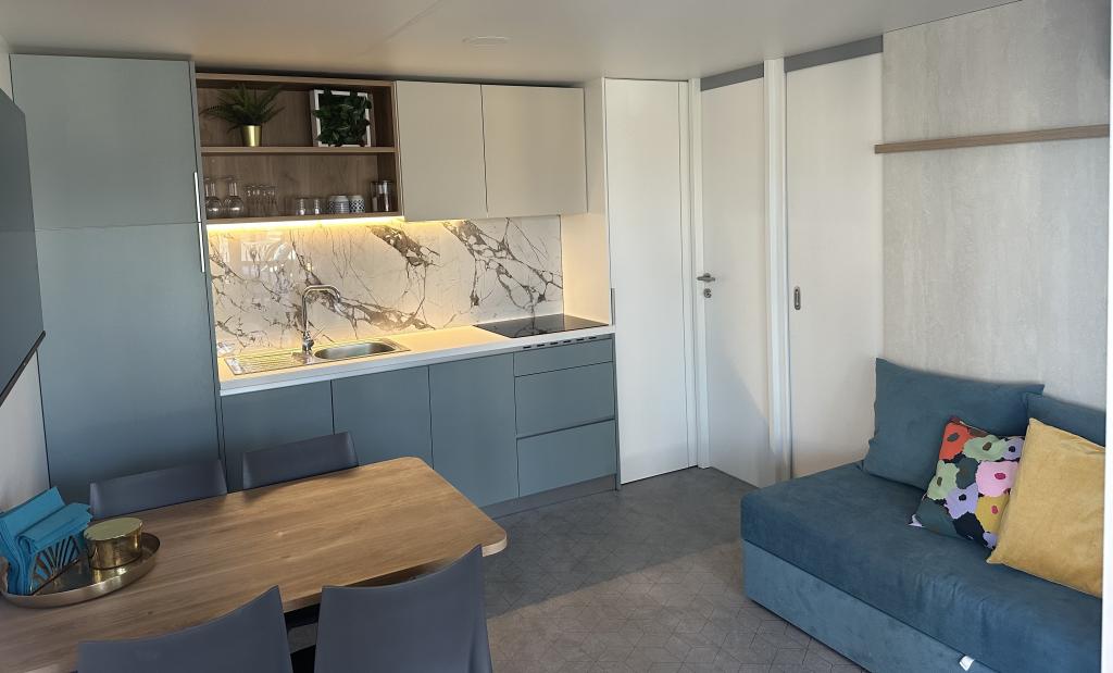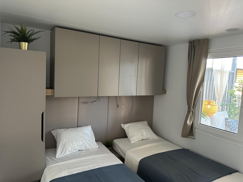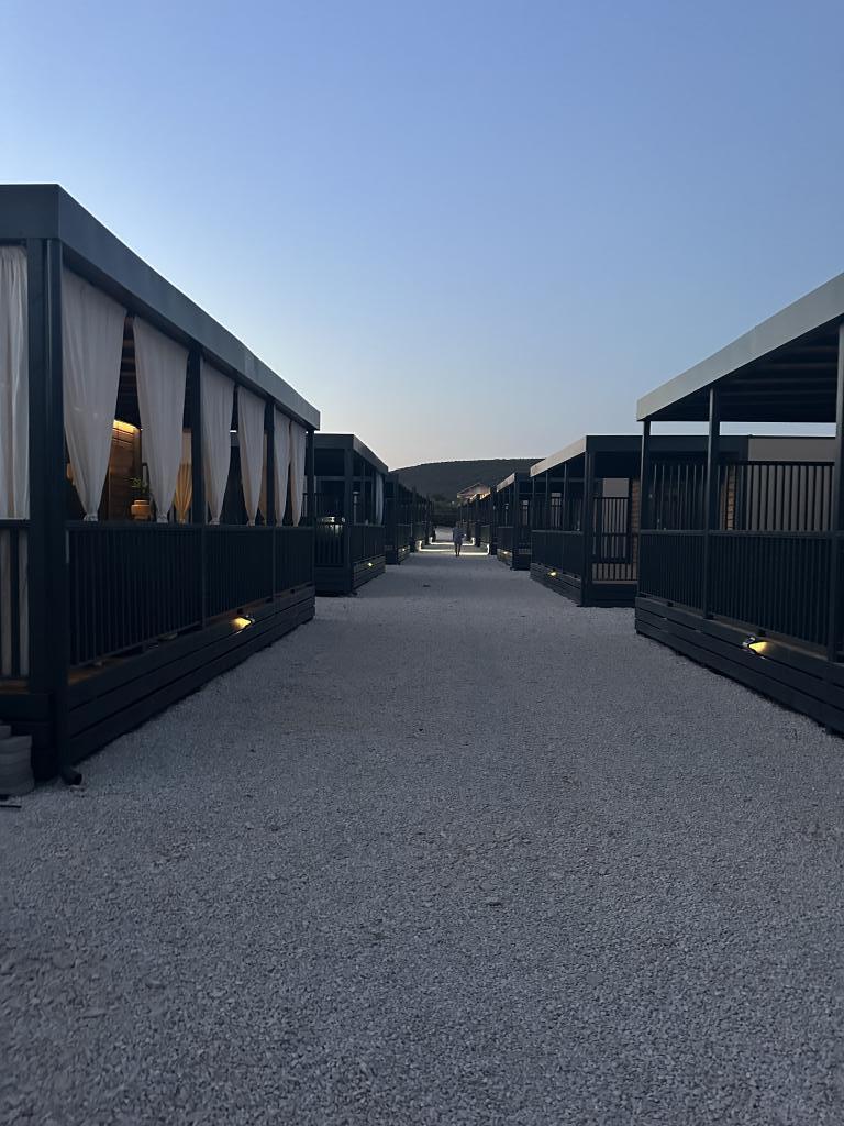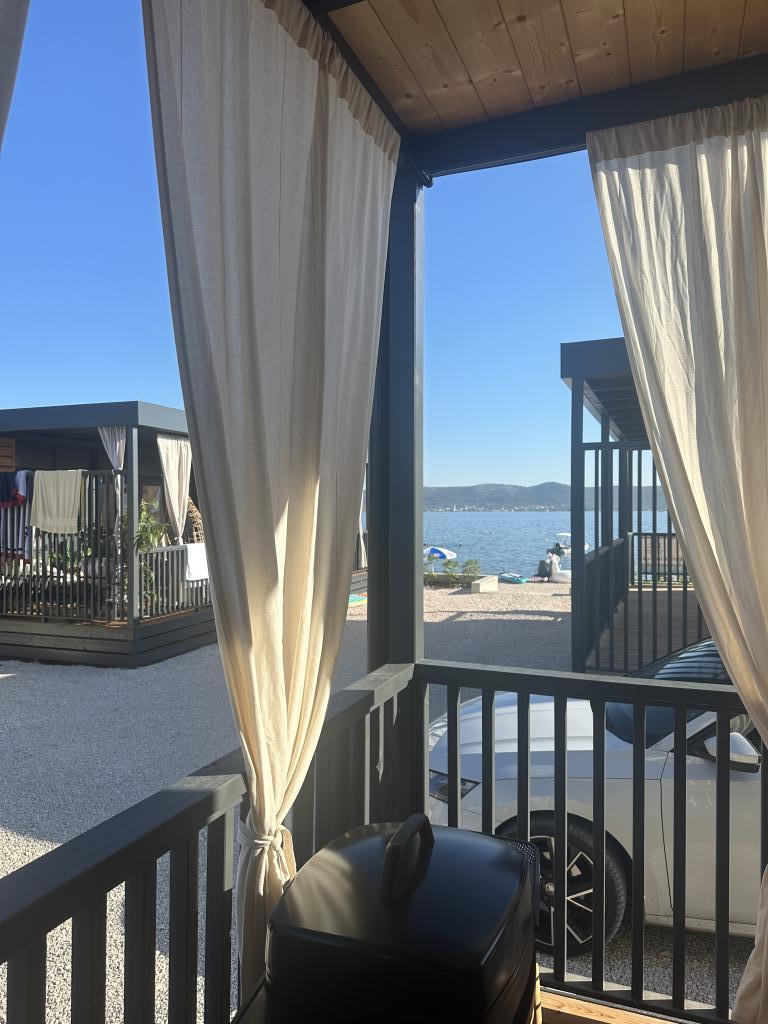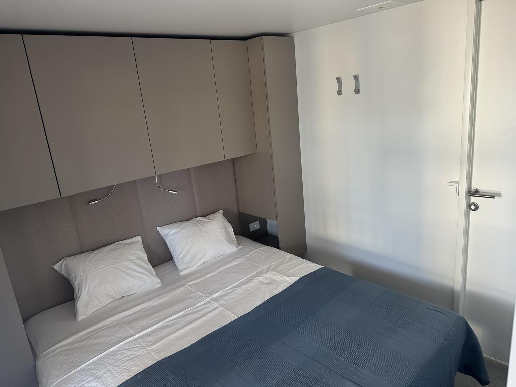 Popolnoma in moderno opremljena mobilna hišica se nahaja v mirnem, manjšem kampu, le nekaj korakov od plaže. Ob čudovitem pogledu na morje lahko uživate na terasi na ležalnikih ali na ležalnikih druge terase, ob rahlem vetriču. Sestavljen je iz 2 spalnic, 2 kopalnic, kuhinje, dnevne sobe z raztegljivim kavčem. Objekt se nahaja 10 minut hoje ob obali od centra, trgovin, pekarn, restavracij, kavarn. Prva restavracija je oddaljena 2 minuti hoje.