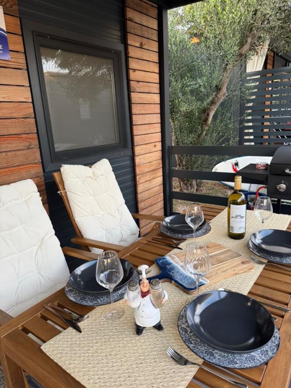 Čudovita mobilna hišica ob morju, le nekaj korakov do čudovite prodnate plaže in mirne obale, blizu restavracij in kavarn, prijetna za počitek in druženje s prijatelji, primerna za otroke, saj se lahko sprehodijo do kopanja kar od same hišice.