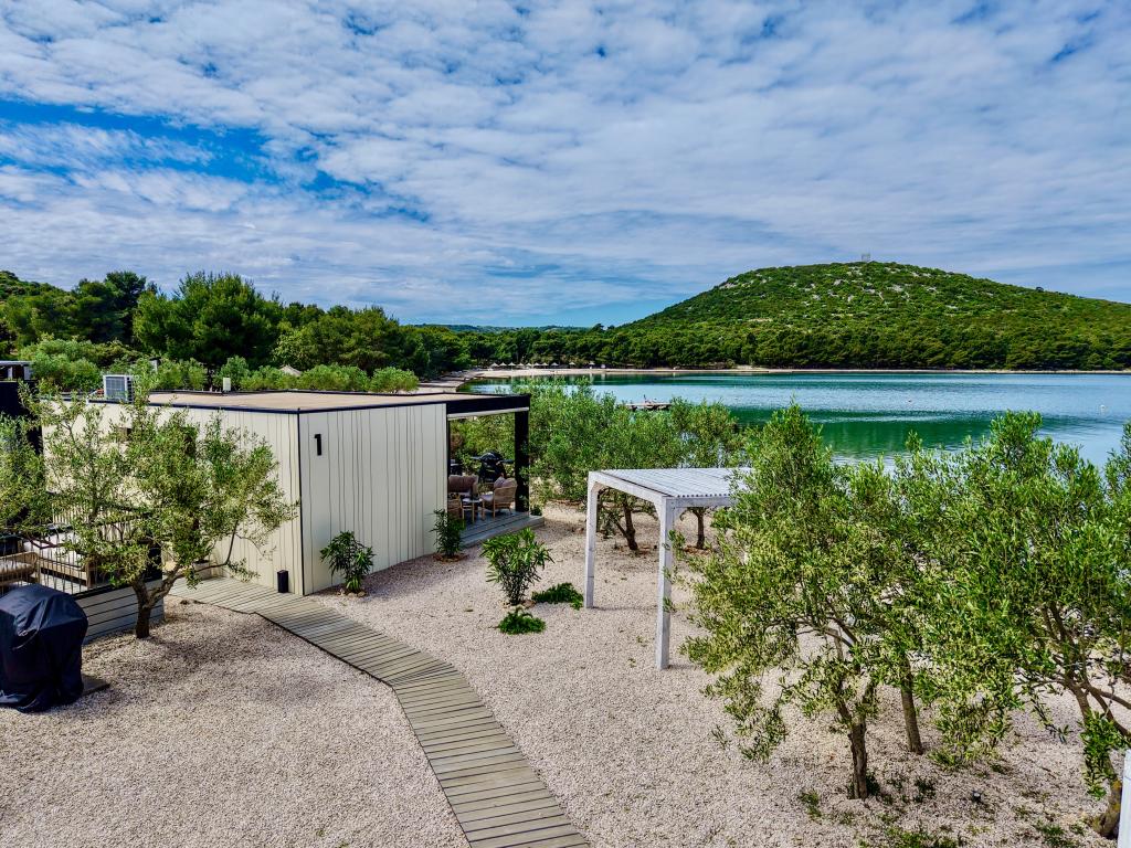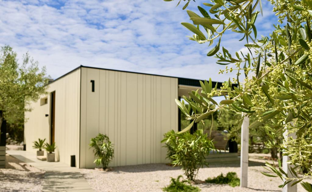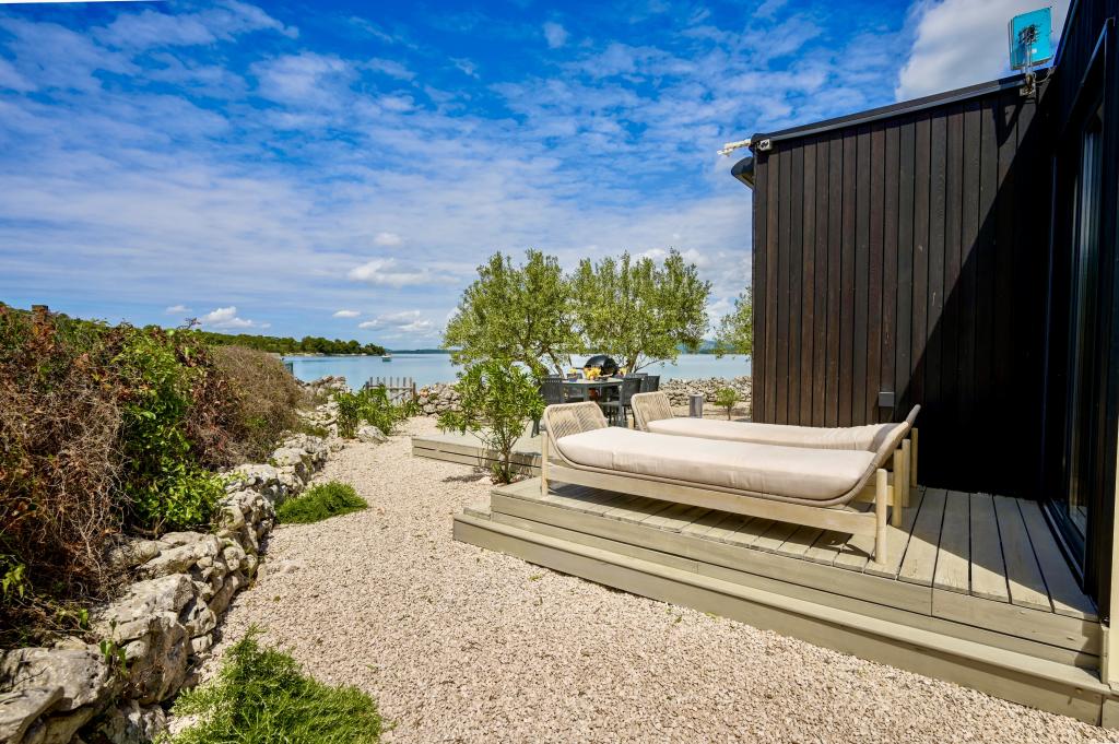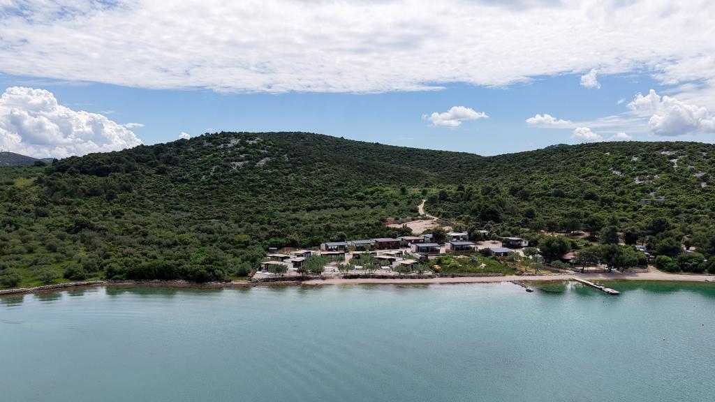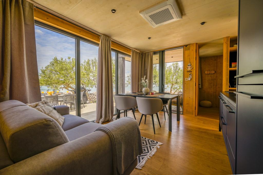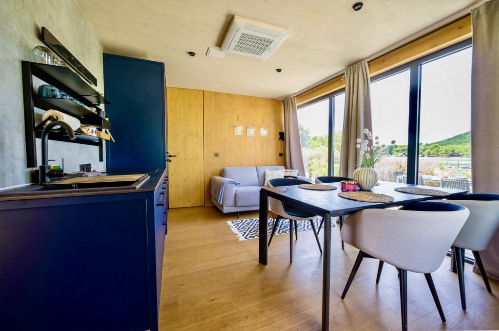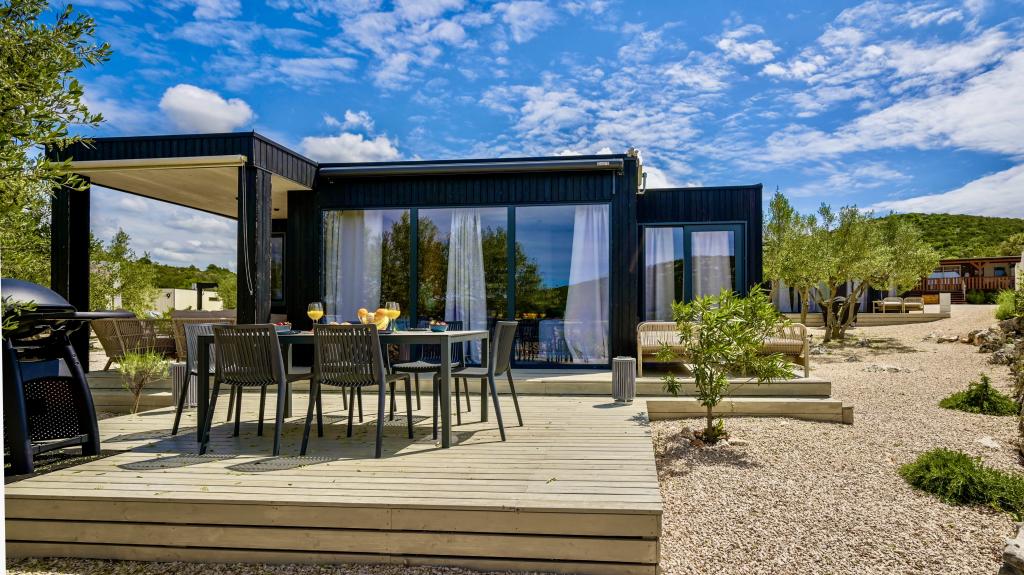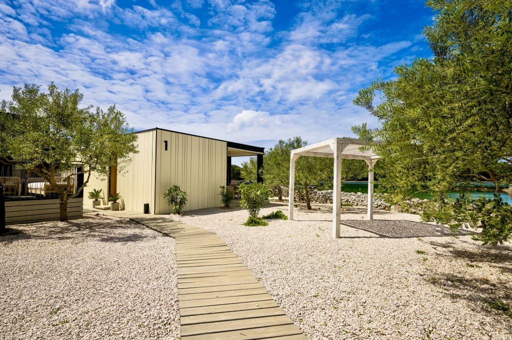 Mobilna hišica je le nekaj korakov od morja. Sodobna notranjost apartmaja se prepleta s tipično Dalmacijo. Obdana z belimi kamenčki in zelenimi oljkami, pred njo pa je le neskončna modrina. Morje, sonce in veter ustvarjajo nepopisno igro, ki navdušuje vse čute. Ne glede na to, ali spite v eni od dveh spalnic, lahko zjutraj uživate v modrini morja in sončnem žaru. Iz popolnoma opremljene kuhinje z vsem potrebnim (vključno s pomivalnim strojem in zamrzovalnikom) in prostorne jedilne mize pa se ponuja nepopisen razgled na teraso in vse čare, ki jih ponujata sonce in morje. Ne glede na to, ali pripravljate obrok v kuhinji ali pečete na žaru na terasi, vam je zagotovljen popoln mir in zasebnost. Cilj vsakega dopusta je pustiti vsakdanje življenje in rutino za seboj, in prav to ponuja naš objekt. Čeprav je obkrožen z 8 podobnimi stavbami, boste uživali v popolni zasebnosti in miru, saj vam vsi stojijo ob strani. Edina omejitev pred vami je nebo in morje.
