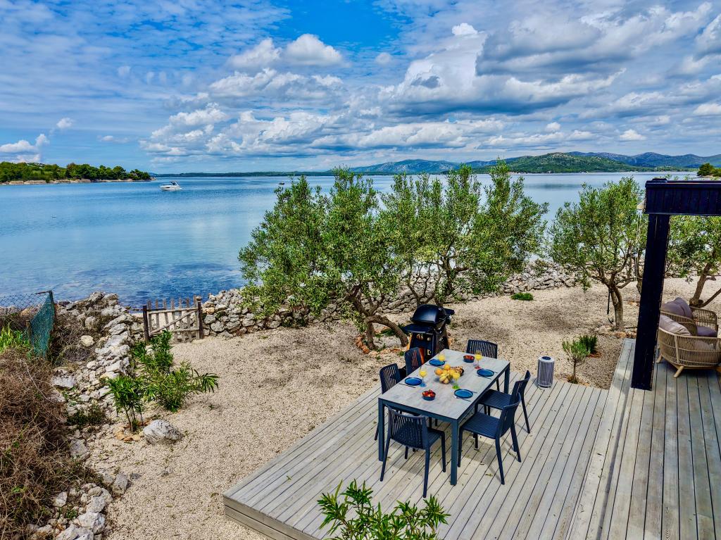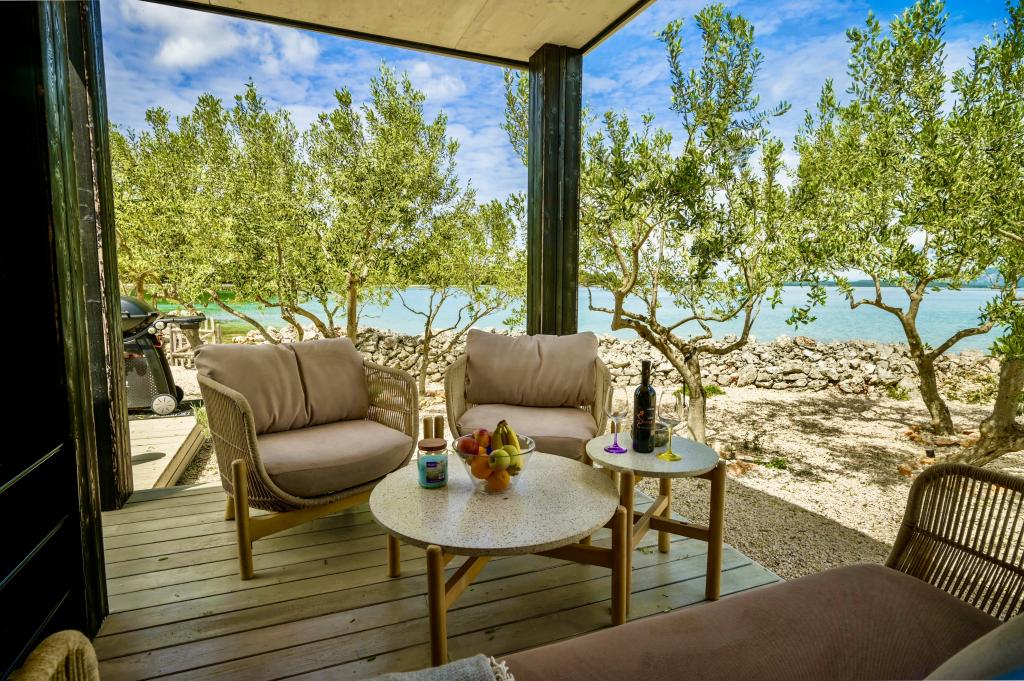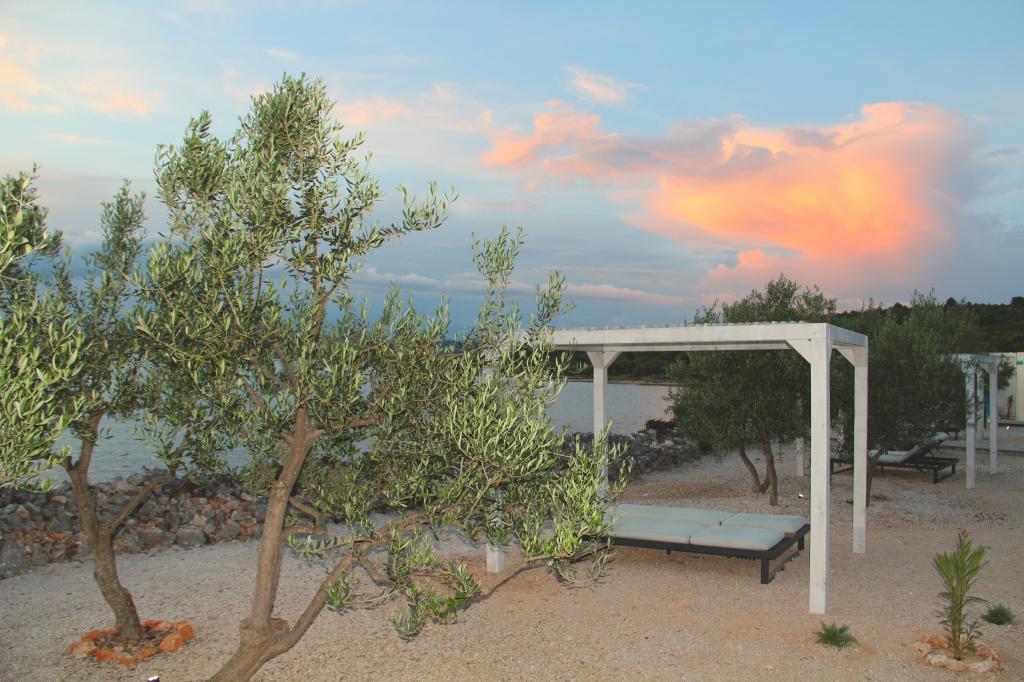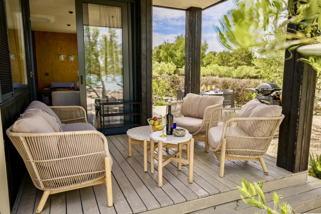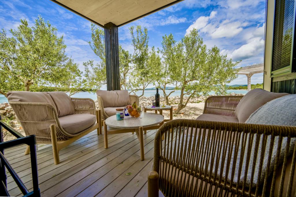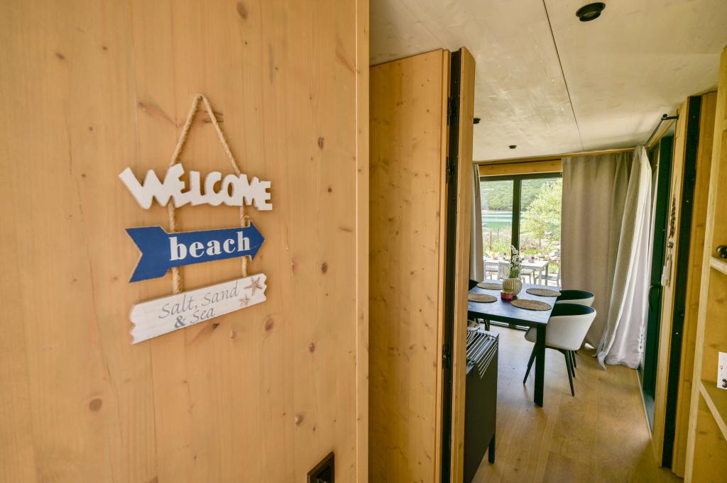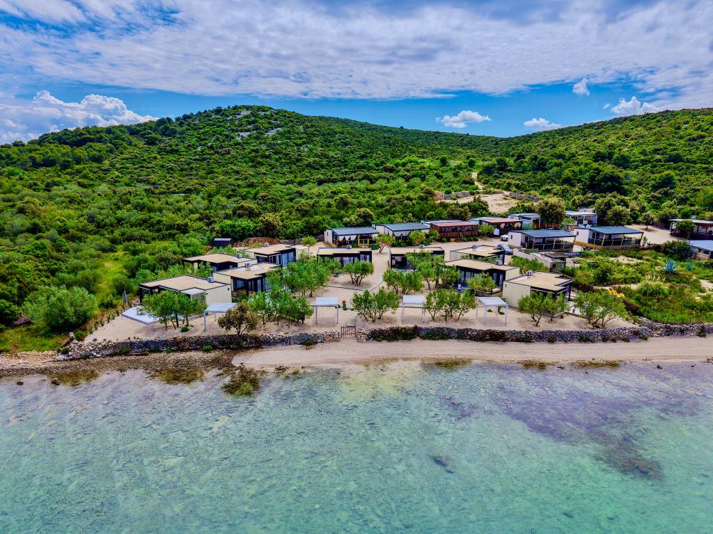 Mobilna hišica je le nekaj korakov od morja. Sodobna notranjost apartmaja se prepleta s tipično Dalmacijo. Obdana z belimi kamenčki in zelenimi oljkami, pred njo pa je le neskončna modrina. Morje, sonce in veter ustvarjajo nepopisno igro, ki navdušuje vse čute. Ne glede na to, ali spite v eni od dveh spalnic, lahko zjutraj uživate v modrini morja in sončnem žaru. Iz popolnoma opremljene kuhinje z vsem potrebnim (vključno s pomivalnim strojem in zamrzovalnikom) in prostorne jedilne mize pa se ponuja nepopisen razgled na teraso in vse čare, ki jih ponujata sonce in morje. Ne glede na to, ali pripravljate obrok v kuhinji ali pečete na žaru na terasi, vam je zagotovljen popoln mir in zasebnost. Cilj vsakega dopusta je pustiti vsakdanje življenje in rutino za seboj, in prav to ponuja naš objekt. Čeprav je obkrožen z 8 podobnimi stavbami, boste uživali v popolni zasebnosti in miru, saj vam vsi stojijo ob strani. Edina omejitev pred vami je nebo in morje.