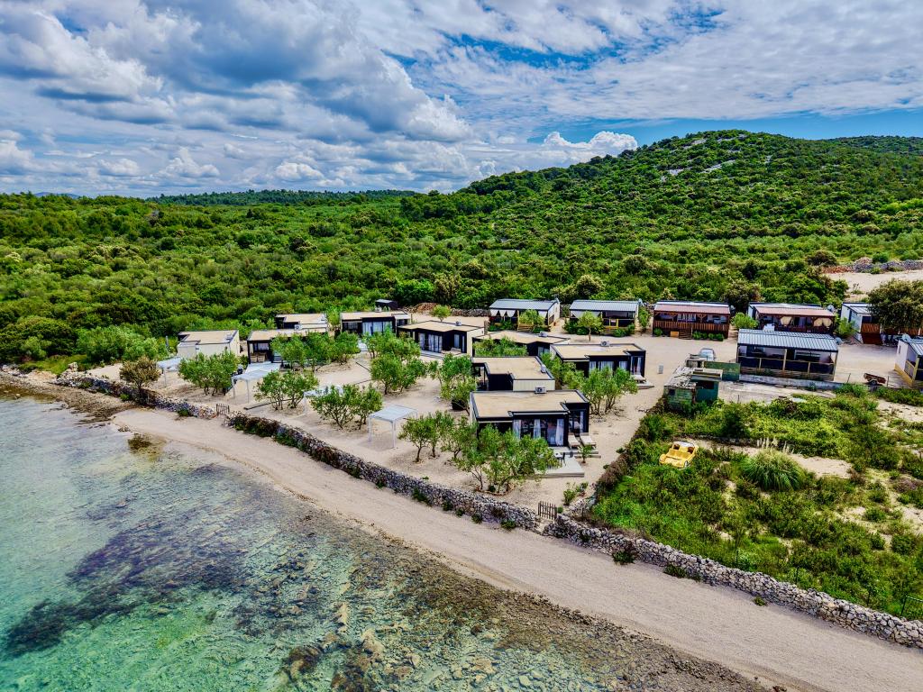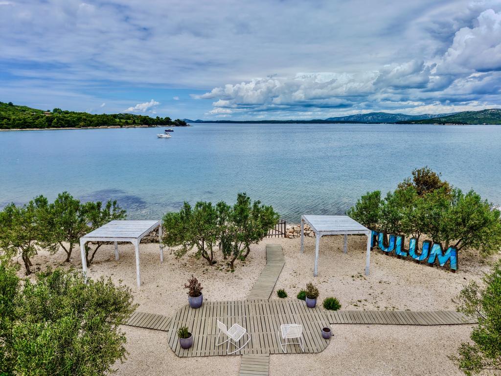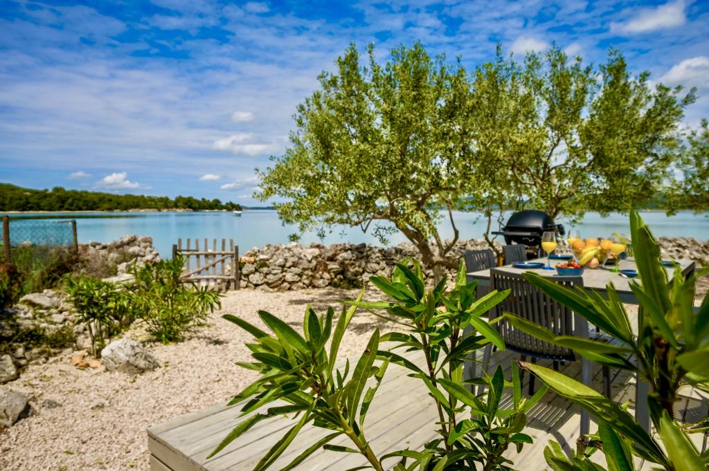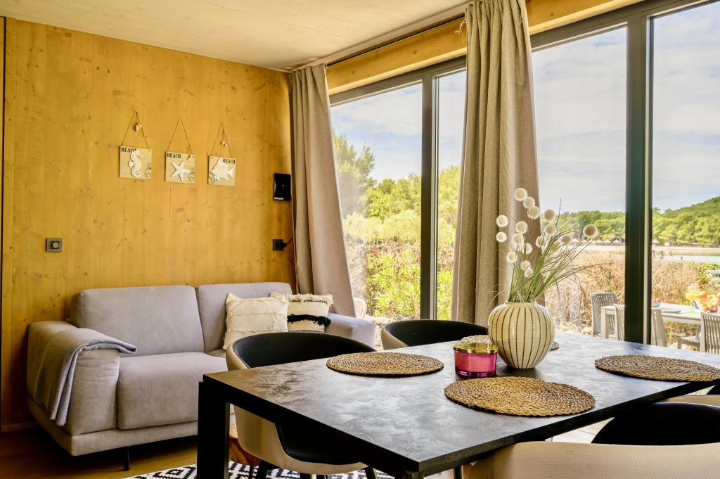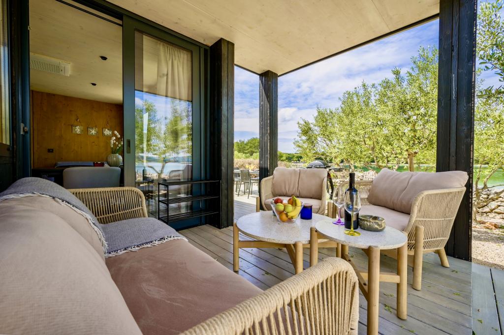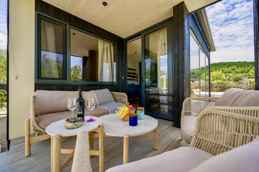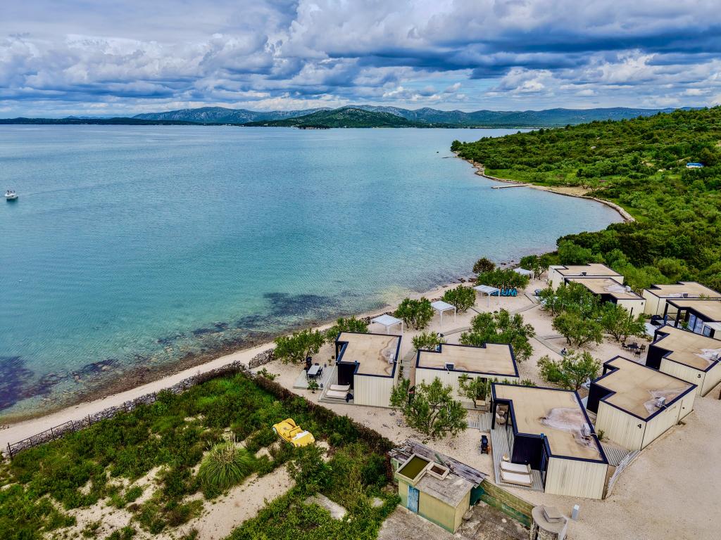 Mobilna hišica je le nekaj korakov od morja. Sodobna notranjost apartmaja se prepleta s tipično Dalmacijo. Obdana z belimi kamenčki in zelenimi oljkami, pred njo pa je le neskončna modrina. Morje, sonce in veter ustvarjajo nepopisno igro, ki navdušuje vse čute. Ne glede na to, ali spite v eni od dveh spalnic, lahko zjutraj uživate v modrini morja in sončnem žaru. Iz popolnoma opremljene kuhinje z vsem potrebnim (vključno s pomivalnim strojem in zamrzovalnikom) in prostorne jedilne mize pa se ponuja nepopisen razgled na teraso in vse čare, ki jih ponujata sonce in morje. Ne glede na to, ali pripravljate obrok v kuhinji ali pečete na žaru na terasi, vam je zagotovljen popoln mir in zasebnost. Cilj vsakega dopusta je pustiti vsakdanje življenje in rutino za seboj, in prav to ponuja naš objekt. Čeprav je obkrožen z 8 podobnimi stavbami, boste uživali v popolni zasebnosti in miru, saj vam vsi stojijo ob strani. Edina omejitev pred vami je nebo in morje.