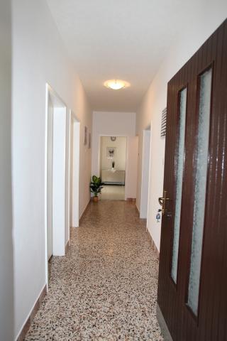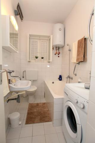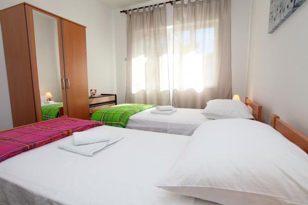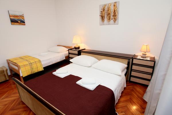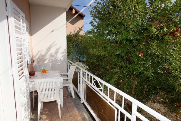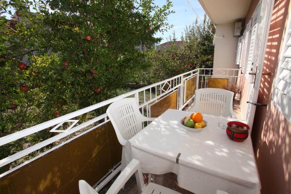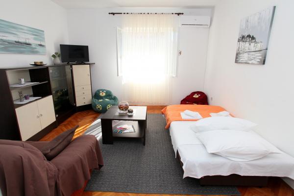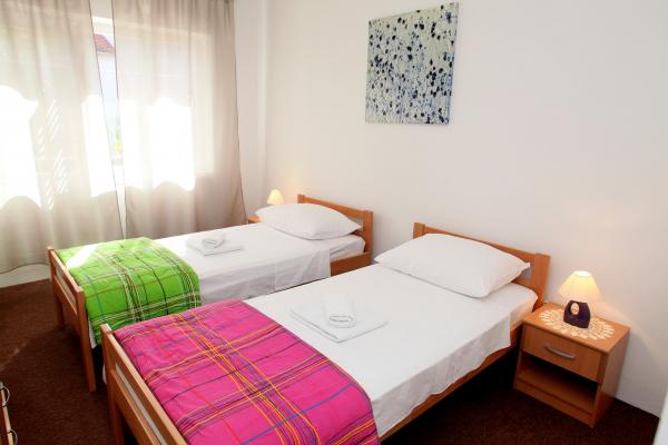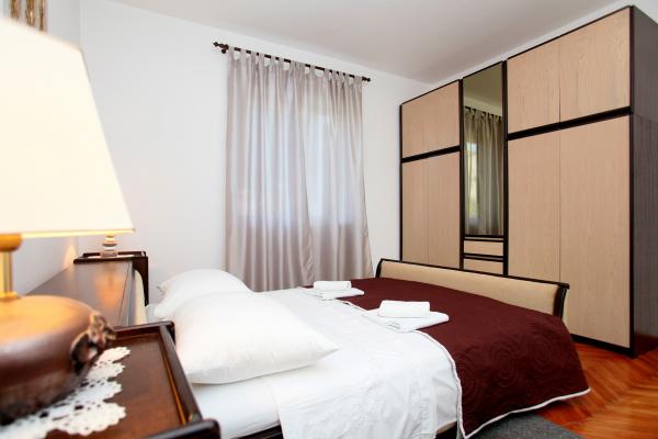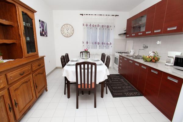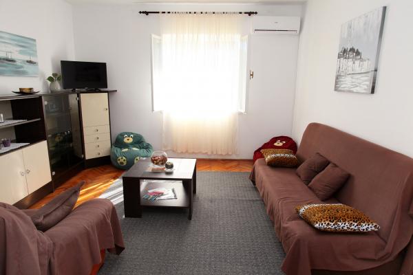 Apartma je 80 m2, udobno in obdan z zelenjem in se nahaja v družinski hiši v bližini starega mestnega jedra (približno 10 minut hoje). Apartma je v celoti opremljen in je sestavljen iz dve spalnici (ena trojno in eno dvojno), kuhinja, dnevna soba, kopalnica in majhen WC. V dnevni sobi je dodatno ležišče za dve osebi (klik-klak). Stanovanje ima balkon z mizo in stoli in teraso pred vhodom v stanovanje z mizo za prijetno bivanje v senci. Za stavbo je majhen žar in parkirni prostor za dva avtomobila. Apartma je klimatiziran. Nov javni prodnata plaža je oddaljena približno 500 m. Najbolj znana Trogir peščena plaža je dve avtobusne postaje in 1 km od apartmaja. Z Trogir obali, vsakih 20 minut, po dostopnih cenah, ki vozi taksi čoln najbolj znanih plaž v Trogir območju.