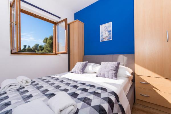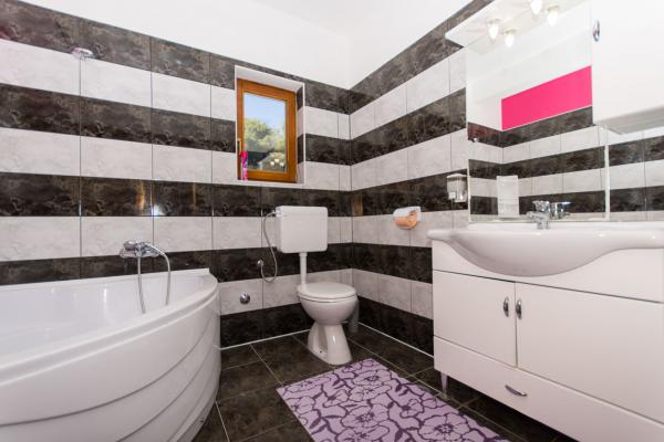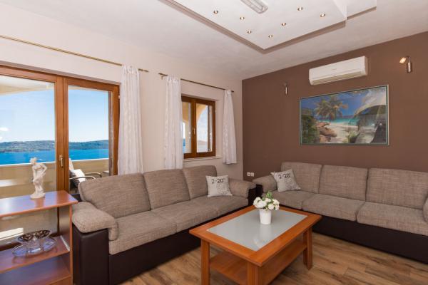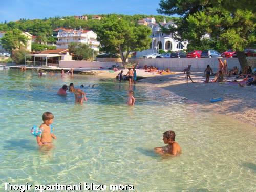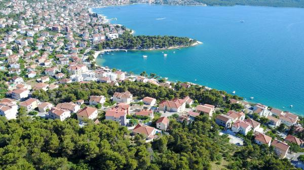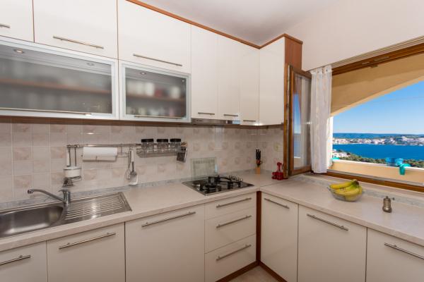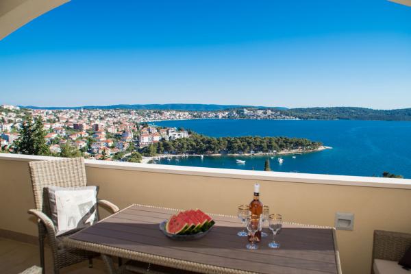 Popolnoma opremljeni in sodobno opremljeni apartmaji s 3 dvoposteljne sobe, velika kopalnica s kotno kadjo (WC), 1 majhno kopalnico z masažno tuš (WC), luksuzno kuhinjo z vsemi aparati in veliko dnevno sobo. V mirnem predelu Trogirja, Čiovo z mostom, z velikim balkonom, iz katerega si lahko ogledate čudovit pogled na morje. Super panorama. Objekt se nahaja 15 minut hoje do centra in 5 minut do plaže. Lastno parkirišče (2 mesti) samo gostje. Gostitelji, ki so vedno na voljo.