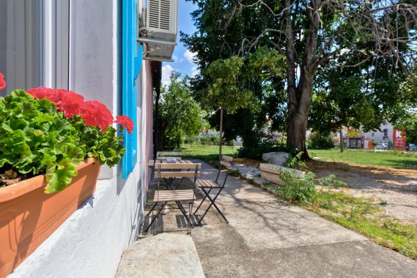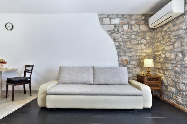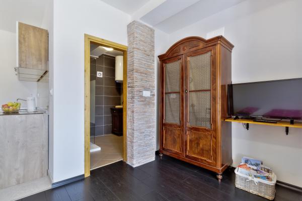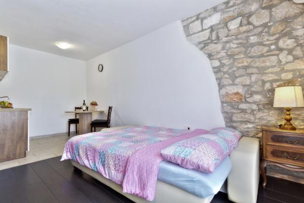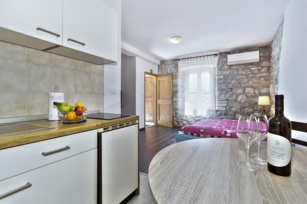 Novi, popolnoma obnovljeni apartmaji v istrskem stilu. Vsaka enota je opremljena z lastno kopalnico, popolnoma opremljeno kuhinjo, klimatsko napravo in teraso. Vsaka enota ima LCD televizijo s satelitskimi programi, in starinsko leseno pohištvo. Kopalnice so opremljene s kabino za prhanje, vročo vodo, brezplačnim toaletnim priborom in brisače. Brezplačen brezžični internet je na voljo po vsej lastnine. Apartmaji se nahajajo 30m od trgovine, 200 metrov od glavne peščene plaže, 500m od centralne teniškega stadiona, 700 metrov od trga in starega mestnega jedra. Parkirišče je na mestu in je brezplačna. Hišni ljubljenčki so dobrodošli in njihovo bivanje je brezplačno. Prihod otroka je možno do 6 let, zaradi velikosti postelje. Ostani za otroke je brezplačno.