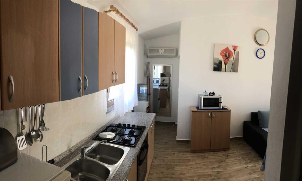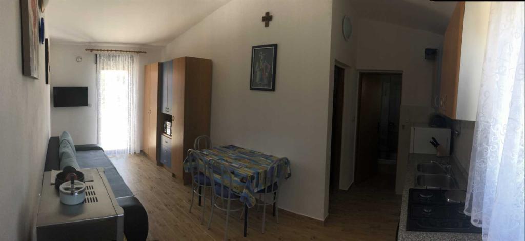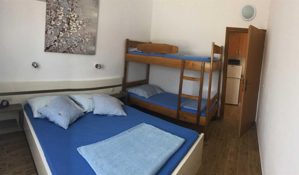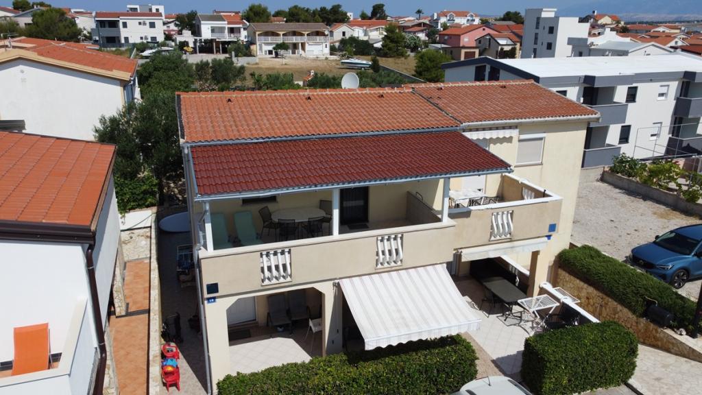 Apartma (***) za 4 osebe, 70m od plaže Žitna uvala, se nahaja v prvem nadstropju. Apartma je opremljen z LED TV (TV+SAT), radiom, Wi-Fi-jem, parkirnim mestom za eno vozilo na ograjenem dvorišču, klimatsko napravo (uporaba vključena v ceno). V kuhinji boste našli vso potrebno opremo in aparate (kot so hladilnik z velikim zamrzovalnikom, mikrovalovna pečica, grelnik vode itd.), spalnica vsebuje zakonsko posteljo in pograd, dodatno ležišče se nahaja v dnevni sobi (z dodatnim ležiščem lahko apartma sprejme 5 oseb), prostoren pokrit balkon velikosti 20 m2 s pogledom na morje (otok Pag in Velebit) z mizo, stoli in ležalniki.