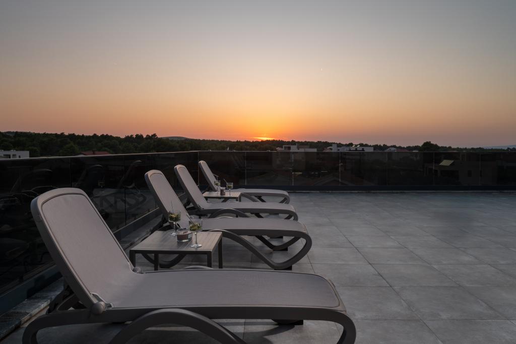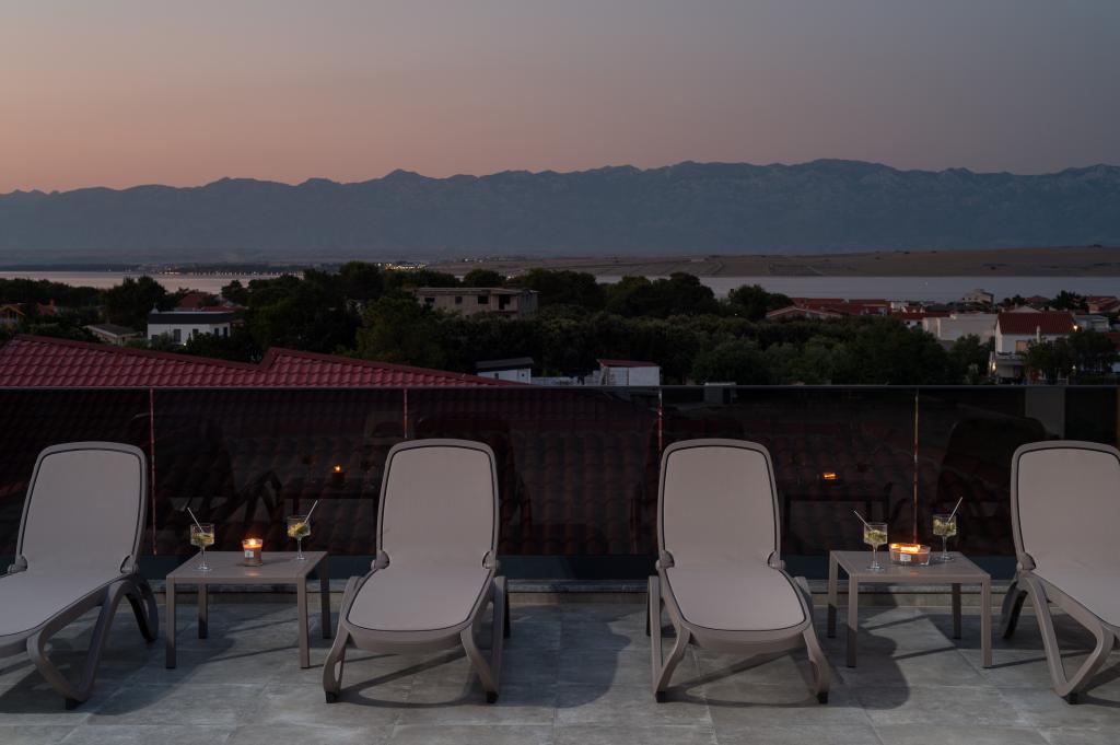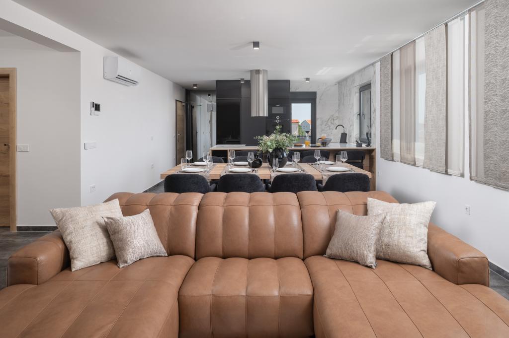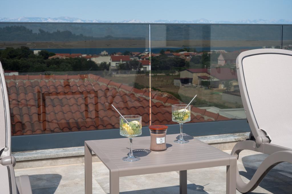 Dizajnersko opremljen in popolnoma na novo opremljen 5-zvezdični penthouse, ki se nahaja v drugem nadstropju, se nahaja v središču otoka Vir. Penthouse s površino 100 m² je idealen za namestitev 4-5 oseb. Razdeljen je na dnevno sobo s popolnoma opremljeno kuhinjo in jedilnico, ločen WC, garderobno sobo, dve klimatizirani spalnici z zakonsko posteljo in satelitsko televizijo ter dve kopalnici (ena s tušem in ena s kadjo). V dnevni sobi je raztegljiv kavč za eno osebo. Penthouse ima pokrit balkon z električnim žarom, mizo in stoli velikosti 3 m², s katerega je delni pogled na morje. Penthouse ima strešno teraso (90 m²) s pogledom na morje in ležalniki.
