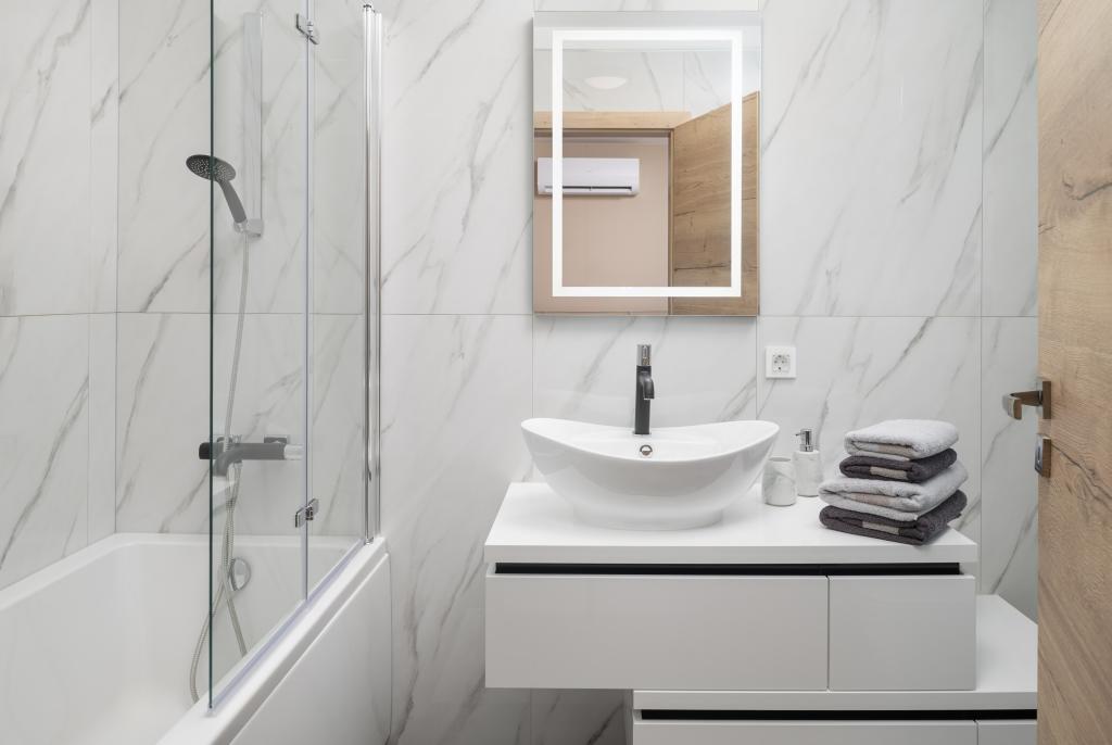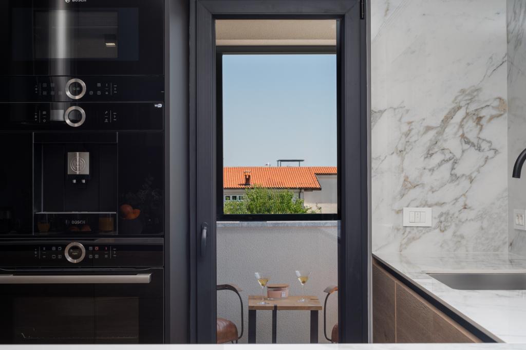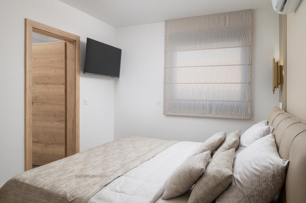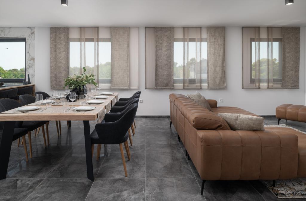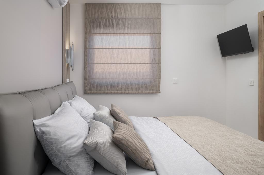 Dizajnersko opremljen in popolnoma na novo opremljen 5-zvezdični penthouse, ki se nahaja v drugem nadstropju, se nahaja v središču otoka Vir. Penthouse s površino 100 m² je idealen za namestitev 4-5 oseb. Razdeljen je na dnevno sobo s popolnoma opremljeno kuhinjo in jedilnico, ločen WC, garderobno sobo, dve klimatizirani spalnici z zakonsko posteljo in satelitsko televizijo ter dve kopalnici (ena s tušem in ena s kadjo). V dnevni sobi je raztegljiv kavč za eno osebo. Penthouse ima pokrit balkon z električnim žarom, mizo in stoli velikosti 3 m², s katerega je delni pogled na morje. Penthouse ima strešno teraso (90 m²) s pogledom na morje in ležalniki.