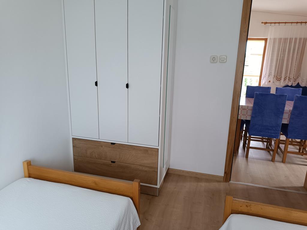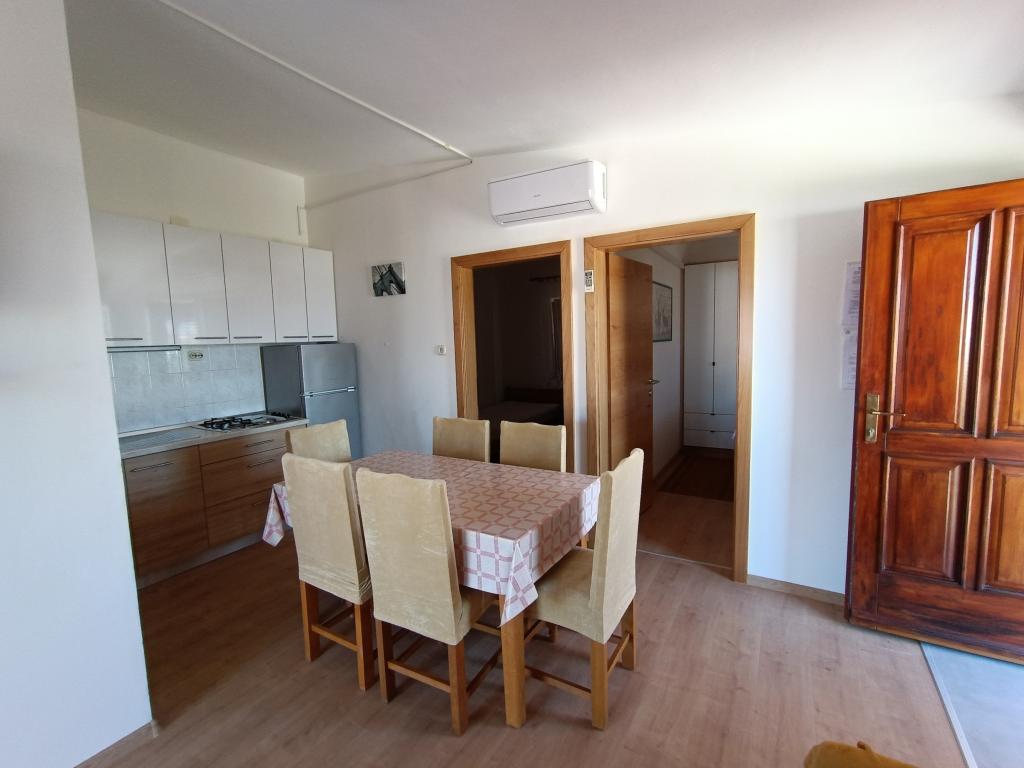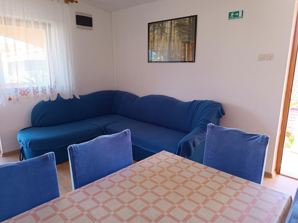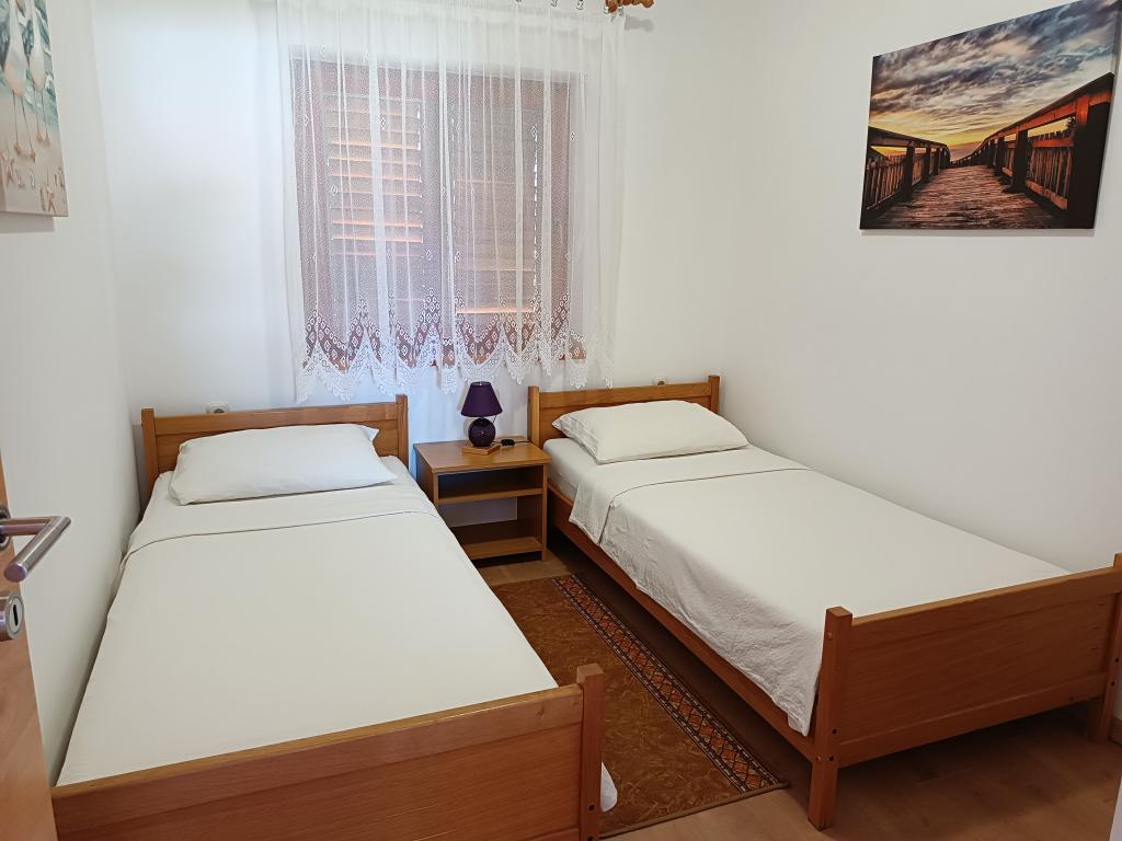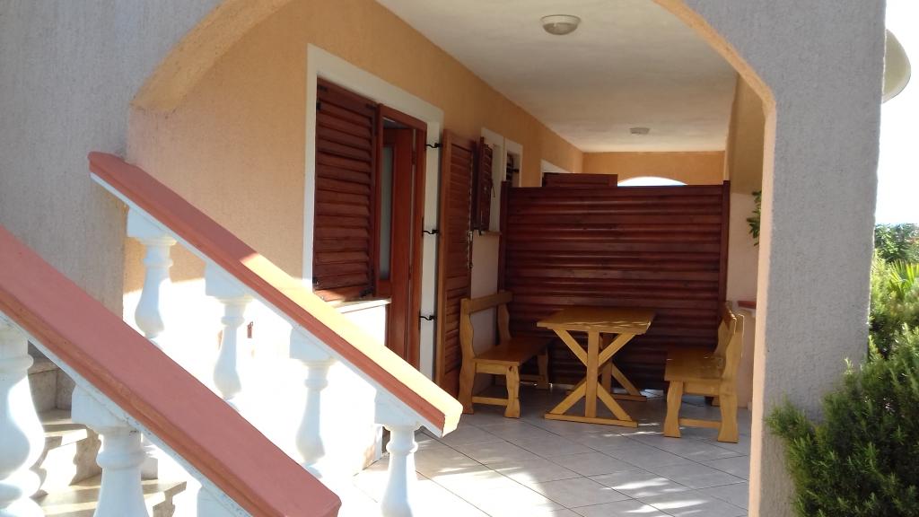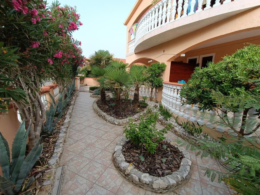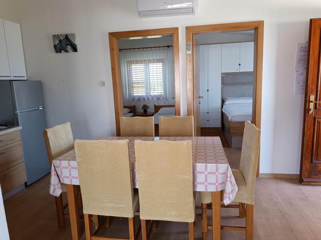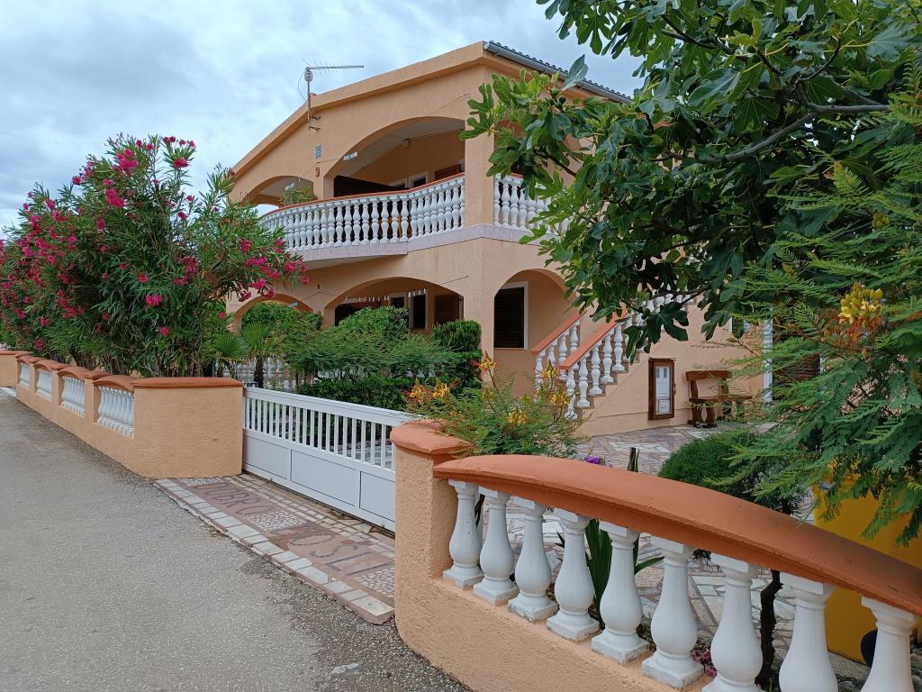 Oddamo tri enake večje klimatizirane apartmaje za 4 osebe, ter en manjši apartma za dve osebi. Ena večja je v pritličju na levi strani, dve pa v nadstropju. Manjša je v pritličju na desni. Večja stanovanja imajo dve spalnici in dnevno sobo, manjša stanovanja pa eno spalnico in dnevno sobo. Vsak apartma ima ločen vhod in teraso 12 kvadratnih metrov. V apartmajih dobite vso posteljnino in posodo za kuhanje ter postrežbo hrane in pijače. Goste prosimo, da s seboj prinesejo sredstva za pomivanje in brisanje posode ter brisače za kopalnico in vse za osebno higieno. Najbližja plaža (Žitna uvala) je oddaljena 100 m. Zunaj na plaži je prod, v vodi pa pesek. Primeren je za otroke. Ob plaži je dolga promenada in kolesarska pot. Na plaži je več restavracij in sladoledarna. V radiju 150-250 metrov se nahajajo prodajalna sadja, pekarna, več trgovin z živili in trgovine z opremo za plažo. Naša ulica ni prometna. Uporabljajo ga samo najemniki in gostje. Je asfaltirana in ima javno razsvetljavo.