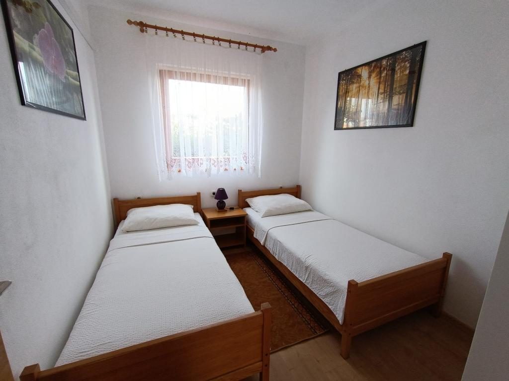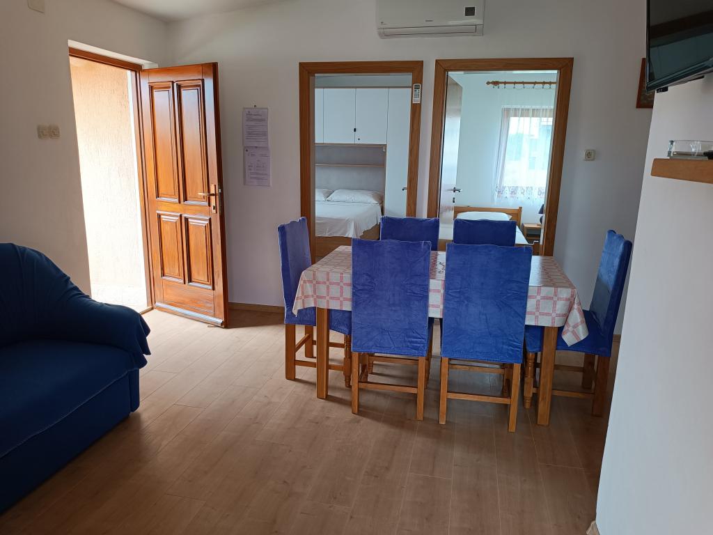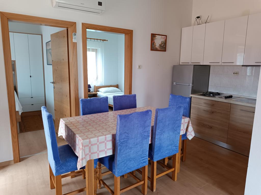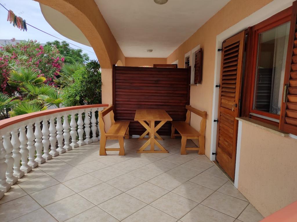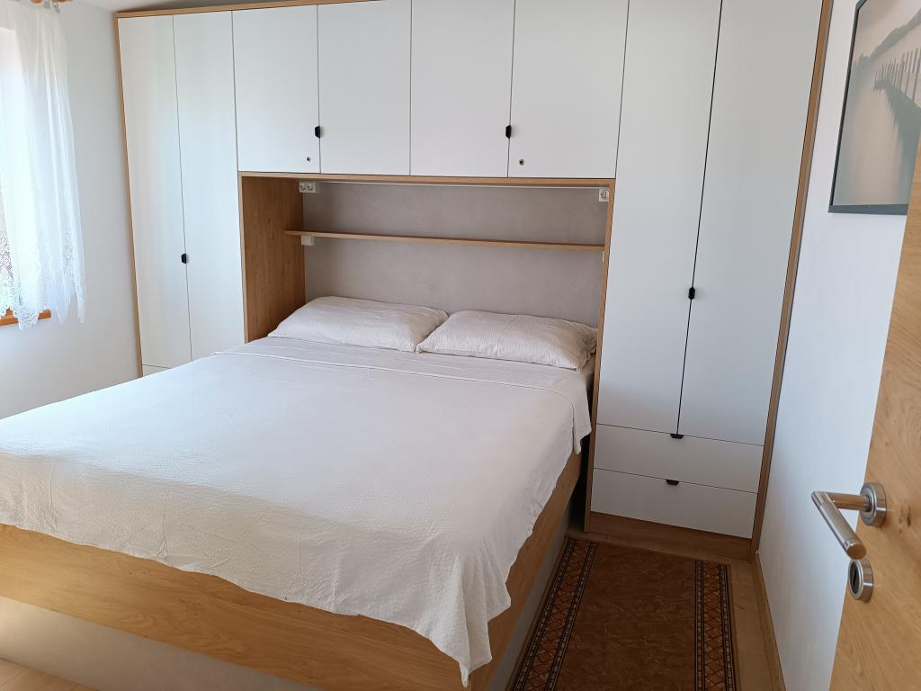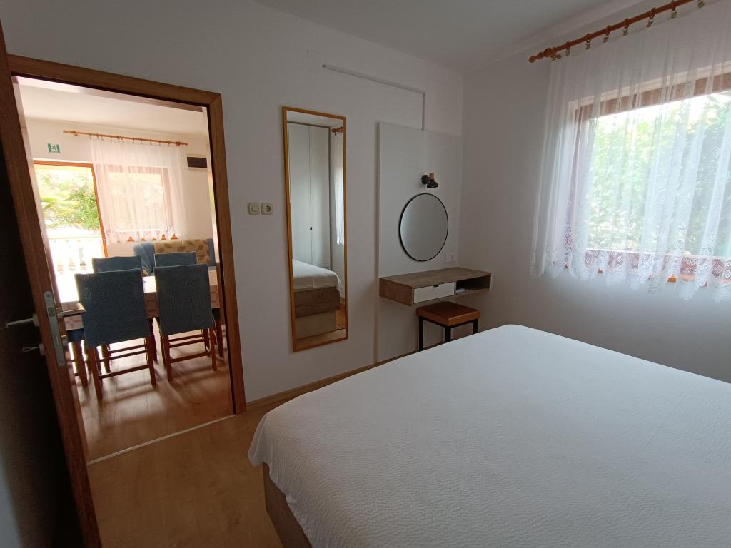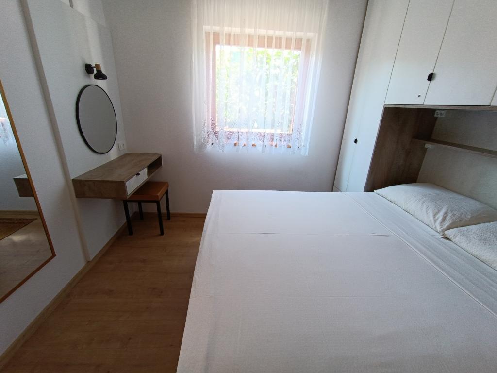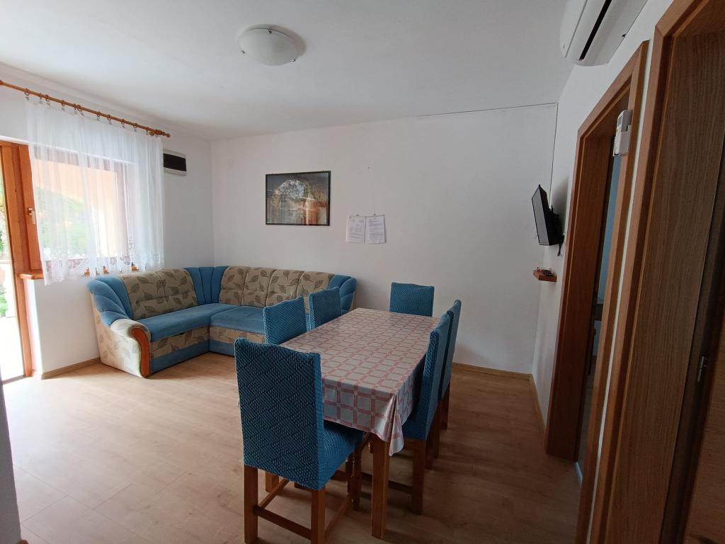 Oddamo tri enake večje klimatizirane apartmaje za 4 osebe, ter en manjši apartma za dve osebi. Ena večja je v pritličju na levi strani, dve pa v nadstropju. Manjša je v pritličju na desni. Večja stanovanja imajo dve spalnici in dnevno sobo, manjša stanovanja pa eno spalnico in dnevno sobo. Vsak apartma ima ločen vhod in teraso 12 kvadratnih metrov. V apartmajih dobite vso posteljnino in posodo za kuhanje ter postrežbo hrane in pijače. Goste prosimo, da s seboj prinesejo sredstva za pomivanje in brisanje posode ter brisače za kopalnico in vse za osebno higieno. Najbližja plaža (Žitna uvala) je oddaljena 100 m. Zunaj na plaži je prod, v vodi pa pesek. Primeren je za otroke. Ob plaži je dolga promenada in kolesarska pot. Na plaži je več restavracij in sladoledarna. V radiju 150-250 metrov se nahajajo prodajalna sadja, pekarna, več trgovin z živili in trgovine z opremo za plažo. Naša ulica ni prometna. Uporabljajo ga samo najemniki in gostje. Je asfaltirana in ima javno razsvetljavo.