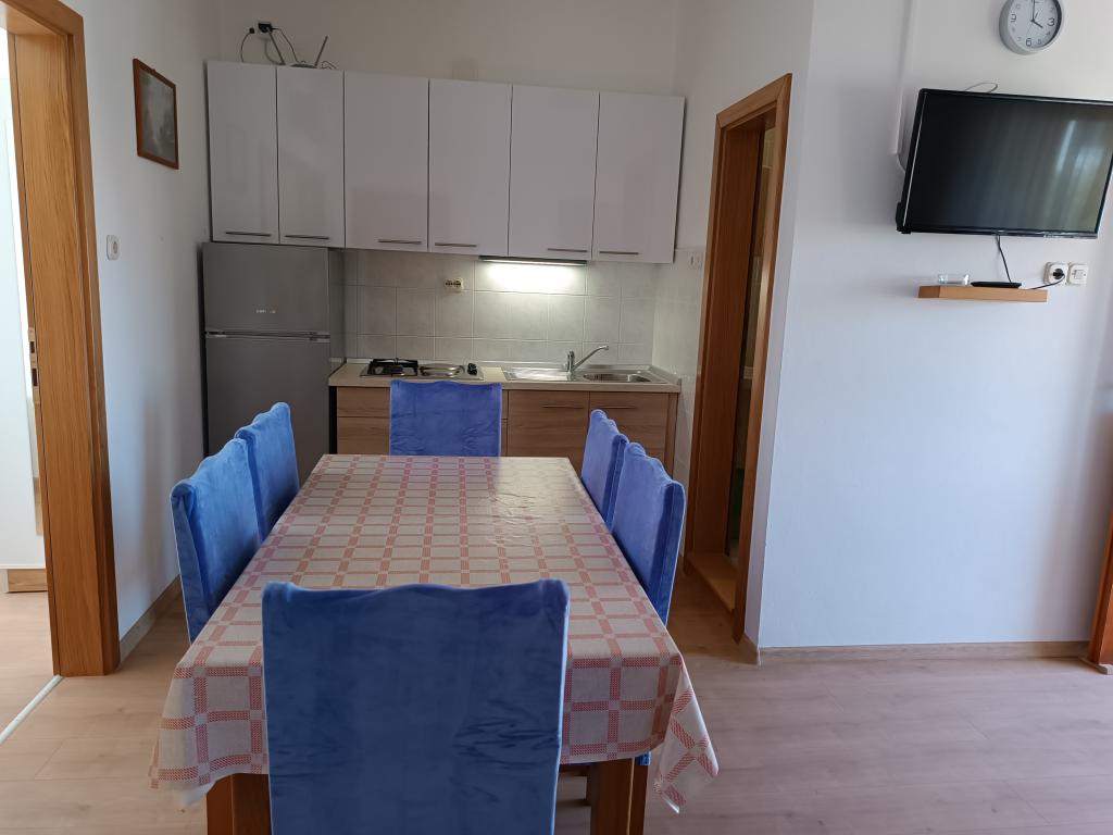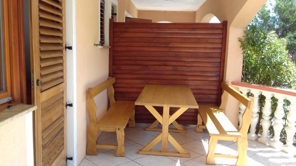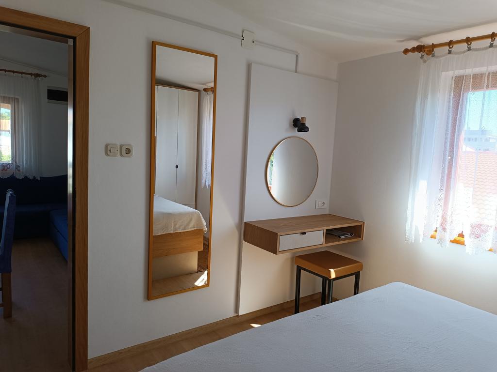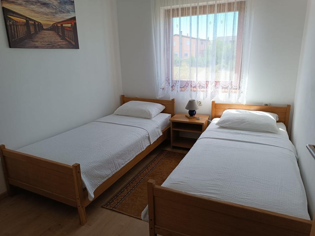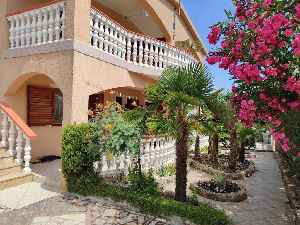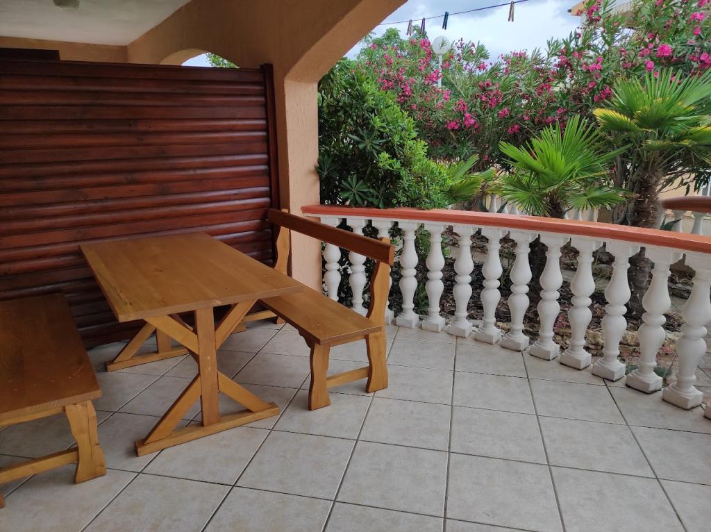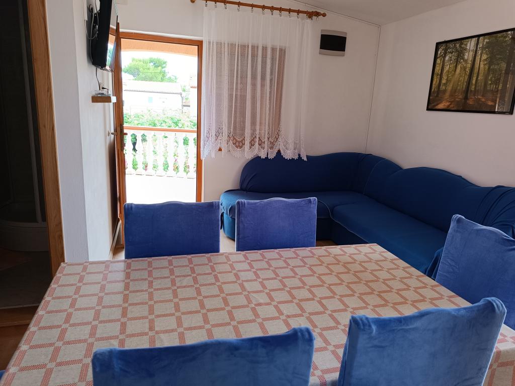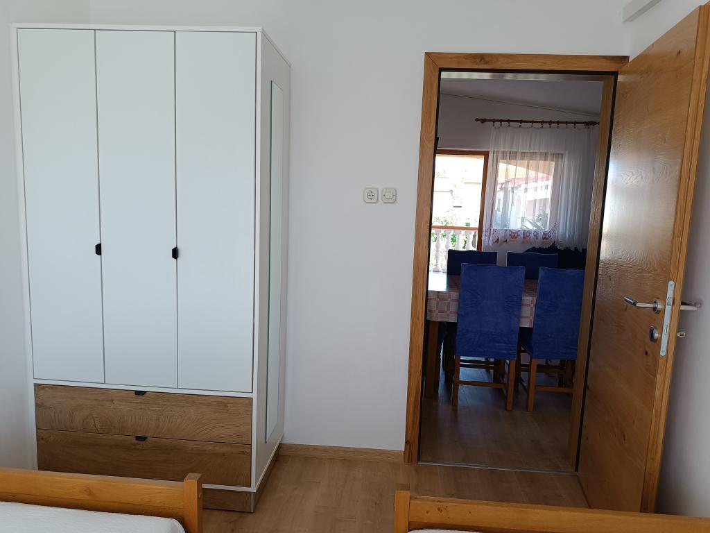Oddamo tri enake večje klimatizirane apartmaje za 4 osebe, ter en manjši apartma za dve osebi. Ena večja je v pritličju na levi strani, dve pa v nadstropju. Manjša je v pritličju na desni. Večja stanovanja imajo dve spalnici in dnevno sobo, manjša stanovanja pa eno spalnico in dnevno sobo. Vsak apartma ima ločen vhod in teraso 12 kvadratnih metrov. V apartmajih dobite vso posteljnino in posodo za kuhanje ter postrežbo hrane in pijače. Goste prosimo, da s seboj prinesejo sredstva za pomivanje in brisanje posode ter brisače za kopalnico in vse za osebno higieno. Najbližja plaža (Žitna uvala) je oddaljena 100 m. Zunaj na plaži je prod, v vodi pa pesek. Primeren je za otroke. Ob plaži je dolga promenada in kolesarska pot. Na plaži je več restavracij in sladoledarna. V radiju 150-250 metrov se nahajajo prodajalna sadja, pekarna, več trgovin z živili in trgovine z opremo za plažo. Naša ulica ni prometna. Uporabljajo ga samo najemniki in gostje. Je asfaltirana in ima javno razsvetljavo.