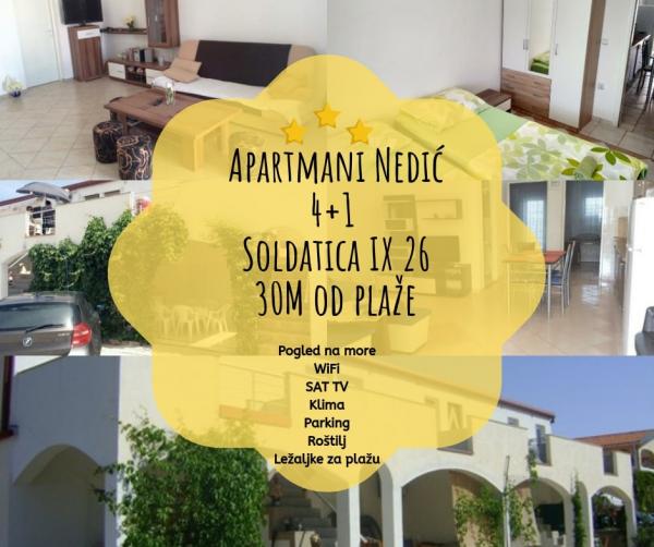 Prostorni in popolnoma opremljeni apartmaji na mirni, vzhodni strani otoka Vir, ki se nahaja le 30 metrov od prodnate plaže. Vsak od 3 apartmajev ima 70 kvadratnih metrov in lahko sprejme do 5 oseb. Apartmaji imajo dve spalnici, veliko dnevno sobo, popolnoma opremljeno kuhinjo in teraso s pogledom na morje. Idealna izbira za družine z otroki ali mlajši pari. Na dvorišču je tudi žar, vsak apartma ima svoje parkirno mesto.
