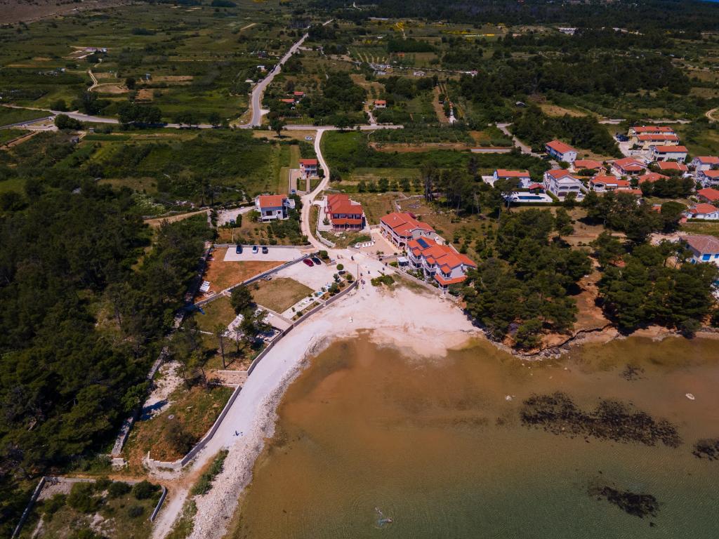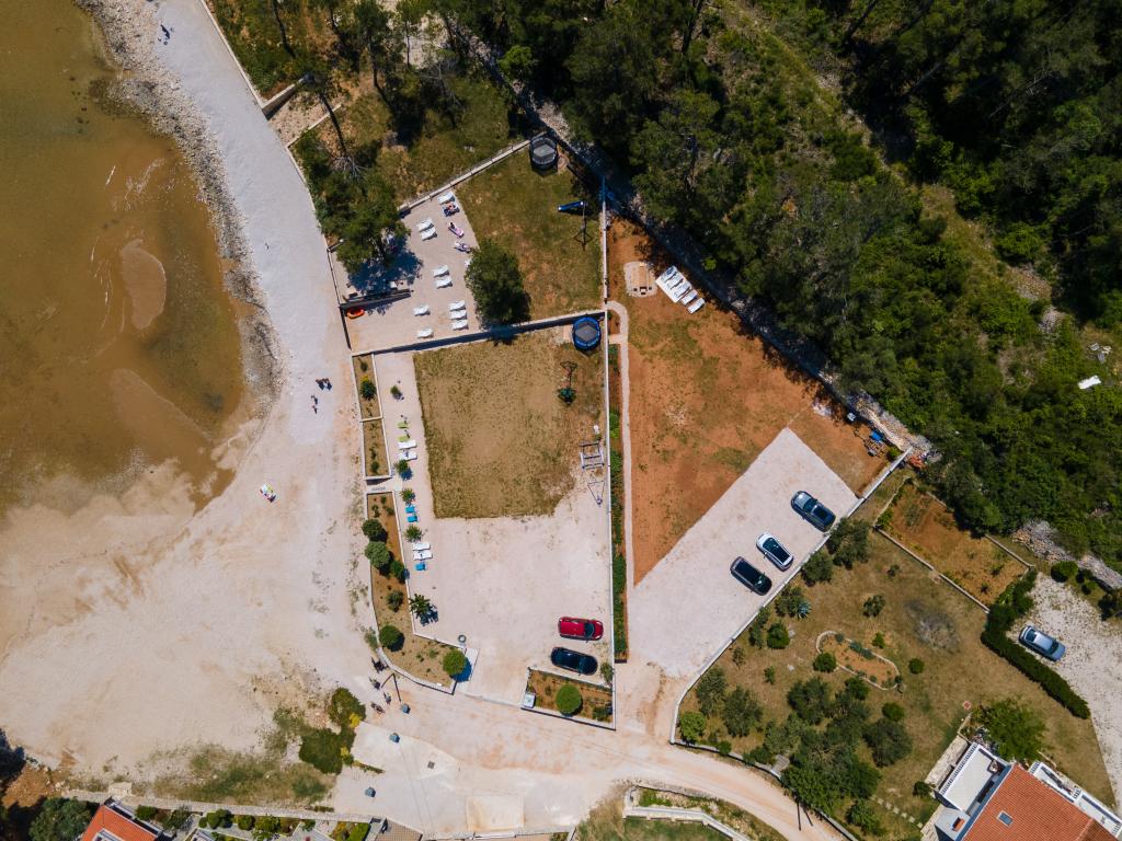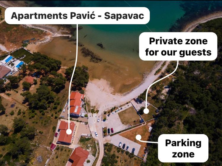 Apartmaji se nahajajo v mirnem zalivu Sapavac, ob sami plaži, obdani z borovim gozdom. Idealno za družinske počitnice, brez hrupa. Apartmaji so novi, moderno urejeni, z vso potrebno opremo in so klimatizirani. Vsak apartma ima svojo teraso s pogledom na morje. Na dvorišču je žar z žarom in prostor za druženje, ki je gostom na voljo brez doplačila. Plaža je prodnata, morje pa ima zelo nežen pesek, idealno za majhne otroke.