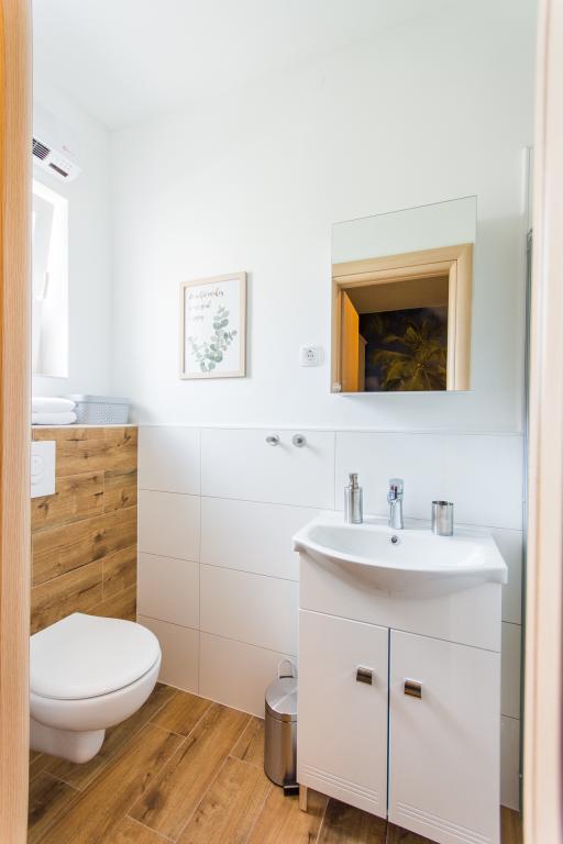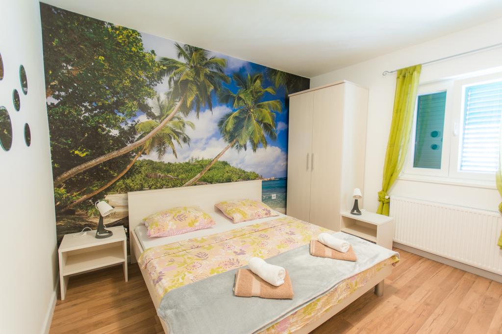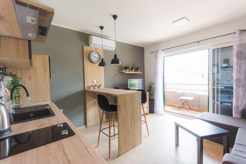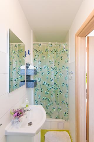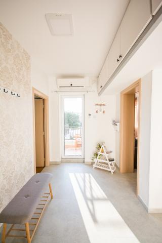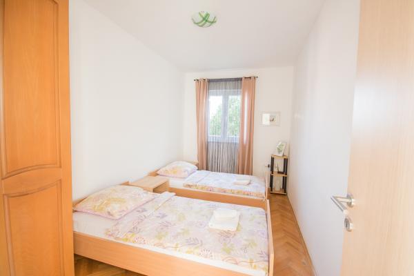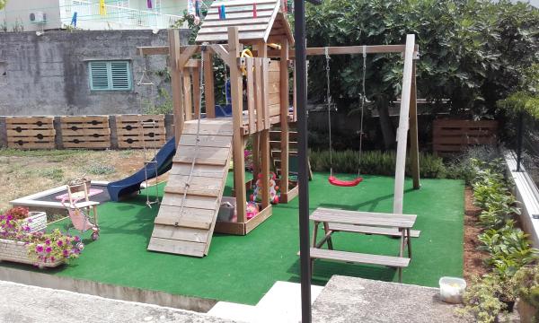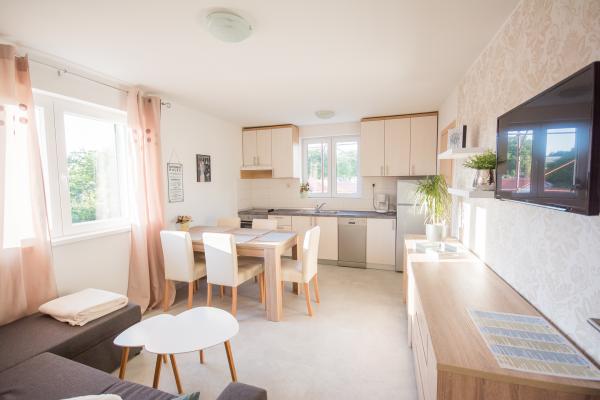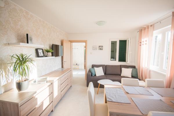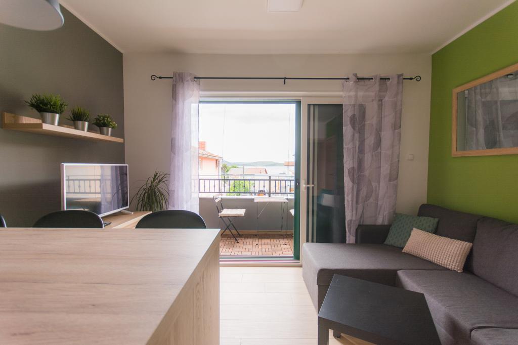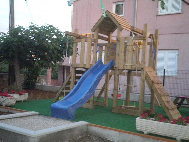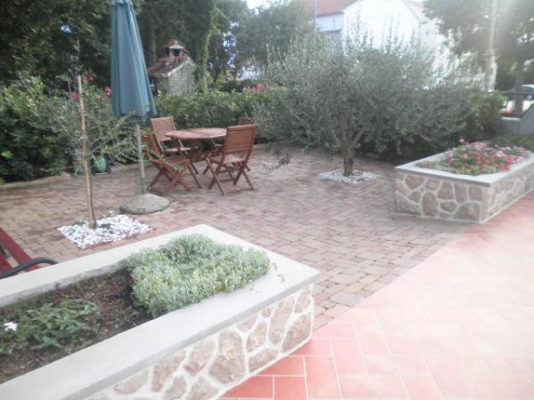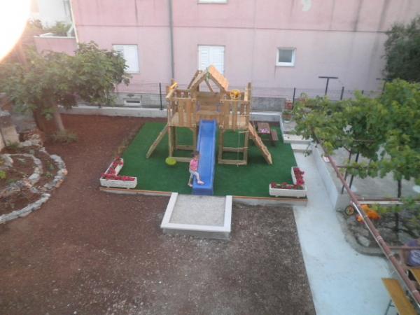 Apartma se nahaja na vhodu v mesto Vodice, v družinski hiši z velikim, zaprtem dvorišču. Dvorišče se nahaja otroško igrišče, prostor za druženje in žar. Popolnoma opremljeno stanovanje je še posebej zanimiv za družine z otroki in hišne ljubljenčke. Objekt se nahaja na 5 minut hoje do peska in prodnate plaže in 15 minut hoje do centra. Čez cesto je supermarket Tommy, na dvorišču hiše je pekarna in družinske rotisseries z pripravljenih jedi. Stanovanje ima dve terasi za uporabo za počitek in sprostitev. Sobe se nahajajo stran od ceste, da lahko gostje uživajo svoje počitnice.