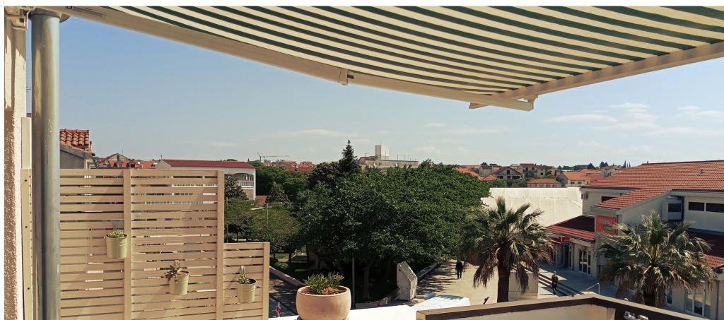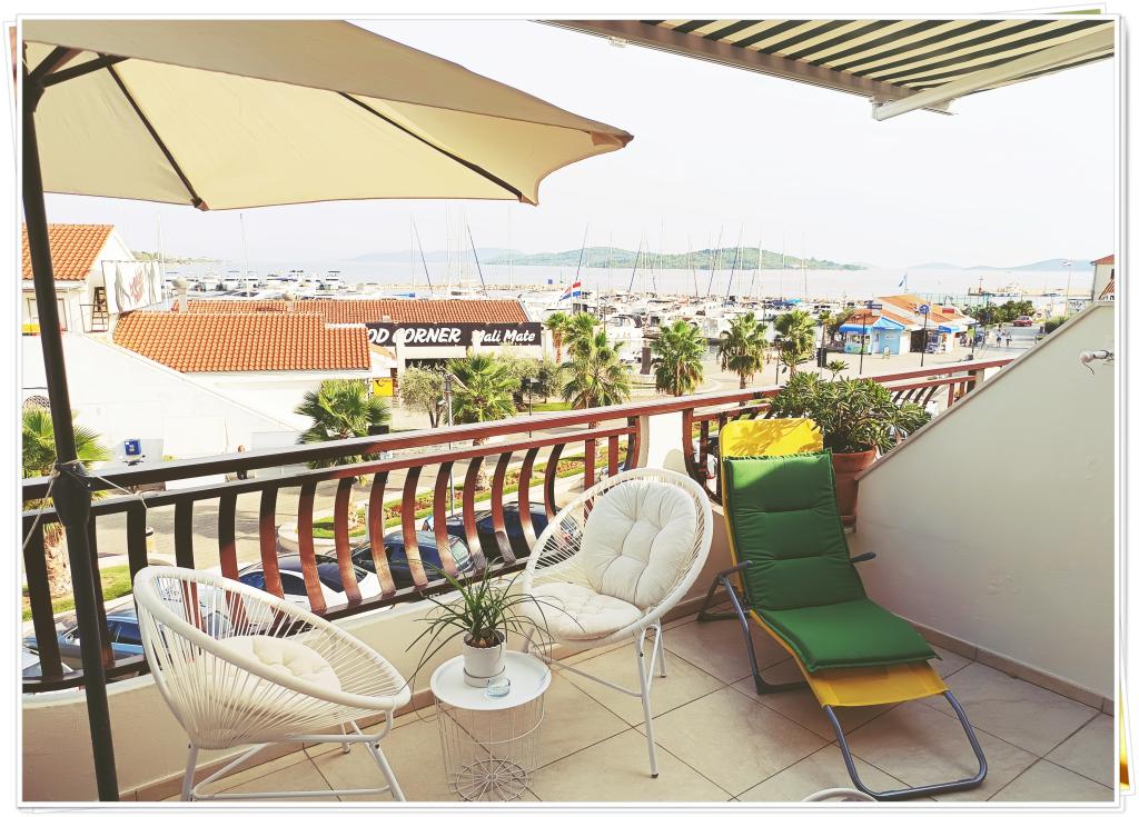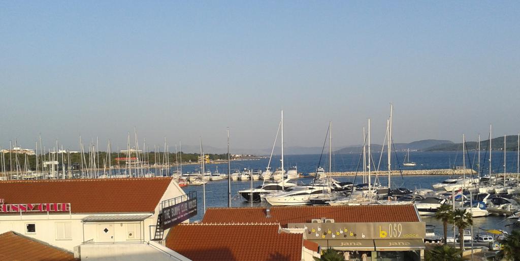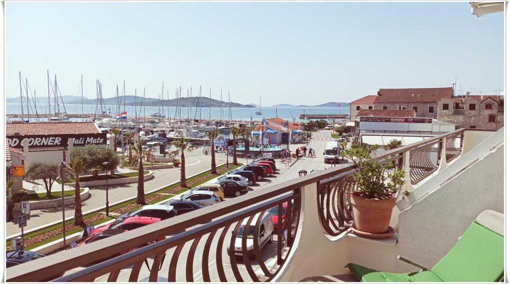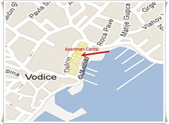 Apartma je v centru Vodic, ima dnevno sobo s kavčem /kanapejem/, kuhinjo, dve dvoposteljni spalnici + veliko posteljo + otroško posteljico, dve kopalnici s tušem, dva bojlerja, dve klimatski napravi, dva stropna ventilatorja, teraso s pogledom na morje, marino, park. Popolnoma je opremljen za daljše bivanje (internet, pralni stroj, pomivalni stroj, kuhinja, brisače, sušilec za lase, likalnik). Od zahodne ali vzhodne plaže je oddaljen približno 350 m.