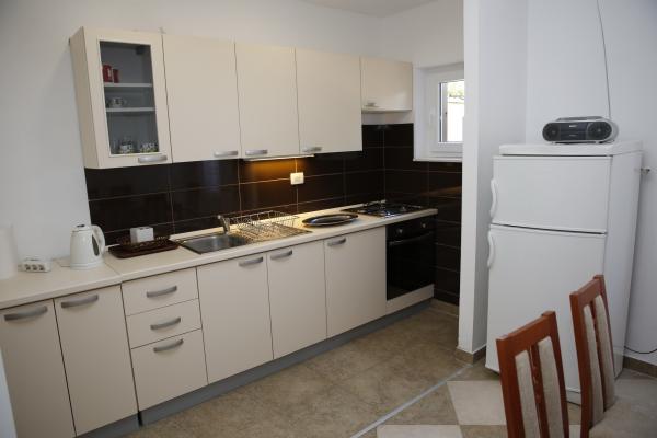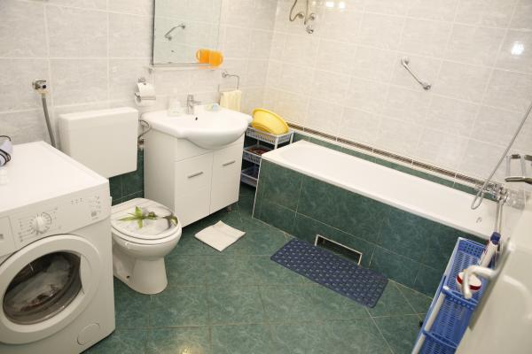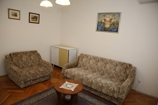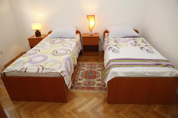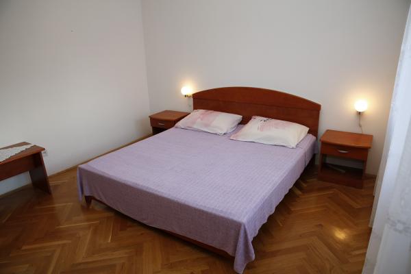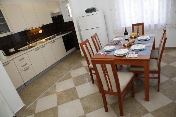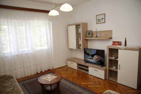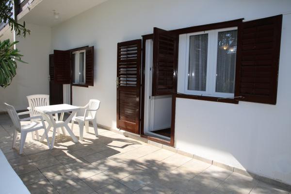Apartma se nahaja v najmirnejšem delu mesta. To je 5 minut hoje do plaže in 10 minut hoje do centra mesta. Apartma je zelo prostoren in odlična postavitev sob. Sestavljen je iz spalnice z zakonsko posteljo, sobe z dvema ločenima posteljama, kuhinje z jedilnico, dnevne sobe z raztegljivim kavčem, kopalnice, velike terase in vrta na jugu. Apartma je zelo prijeten, pred kratkim obnovljen in lepo urejen.