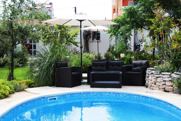 Kmečka oprema majhna vila v mirnem delu mesta, v bližini starega mestnega jedra, in izključuje uporabo avtomobila, za katerega imate parkirni prostor. Vila se nahaja v prostorno in bujnim vrtom z bazenom in otroški park. Vsi potrebni objekti se nahajajo na 10 minut hoje od hotela.