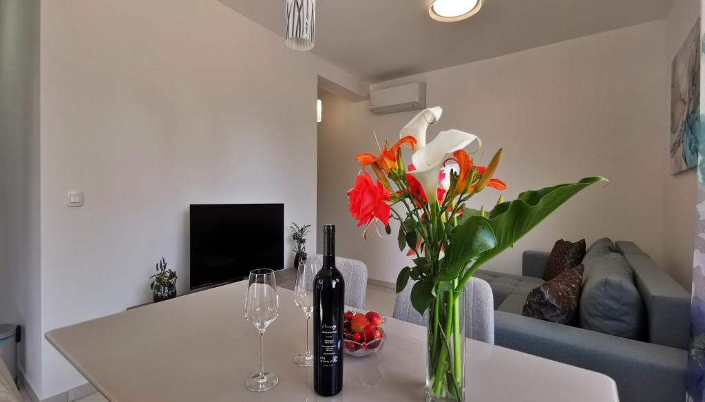 Celotno stanovanje je klimatizirano, Wi-Fi internet hitrosti do 200 Mbit, pomivalni stroj, pralni stroj, sušilni in likalnik, mikrovalovna pečica, kuhalnik vode, pečica, hladilnik z zamrzovalnikom, LCD smart TV z IPTV storitvijo