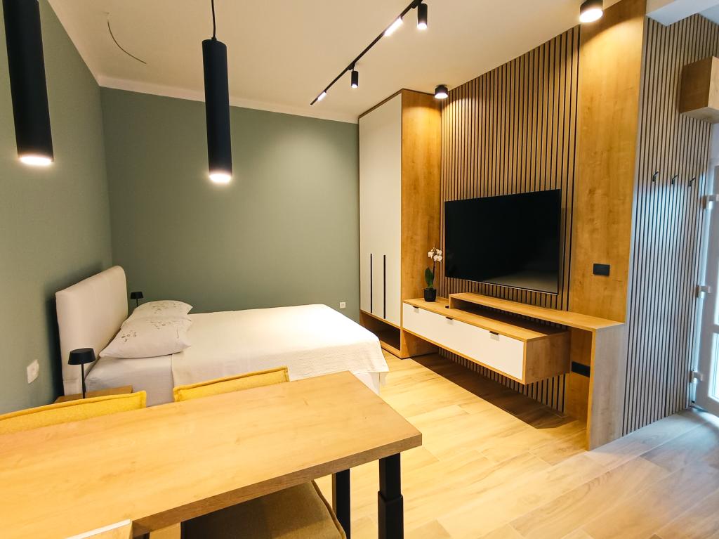 Popolnoma in moderno opremljen studio apartma v mirnem in družinskem okolju. Primeren za pare ali družino z otrokom. Studio apartma je klimatiziran in ima vse aparate in udobje, potrebne za brezskrben oddih v Zadru. Zakonska postelja tipa BOX, dimenzij 160x200 z udobno vzmetnico. Od elektronskih naprav še posebej izpostavljamo velik televizor, pomivalni stroj, pralnico s pralnim strojem in vgrajen hladilnik z zamrzovalnikom. Studio apartma vsebuje vse potrebne kuhinjske pripomočke in osnovne začimbe. Po dogovoru lahko dodamo otroško posteljico, otroški stolček ali dodatno ležišče. Studio apartma ima zasebno parkirišče, za tiste, ki radi hodijo, pa je center mesta oddaljen približno 20 minut hoje. V bližini se nahaja športno-rekreacijski center Višnjik, ki je idealen za vse, ki radi telovadijo na prostem, poleg katerega je tudi veliko otroško igrišče.