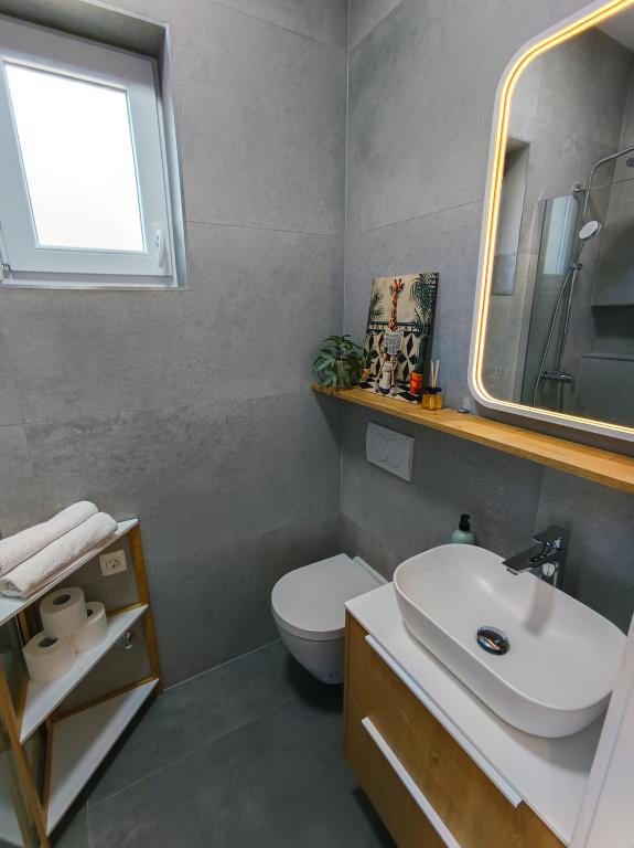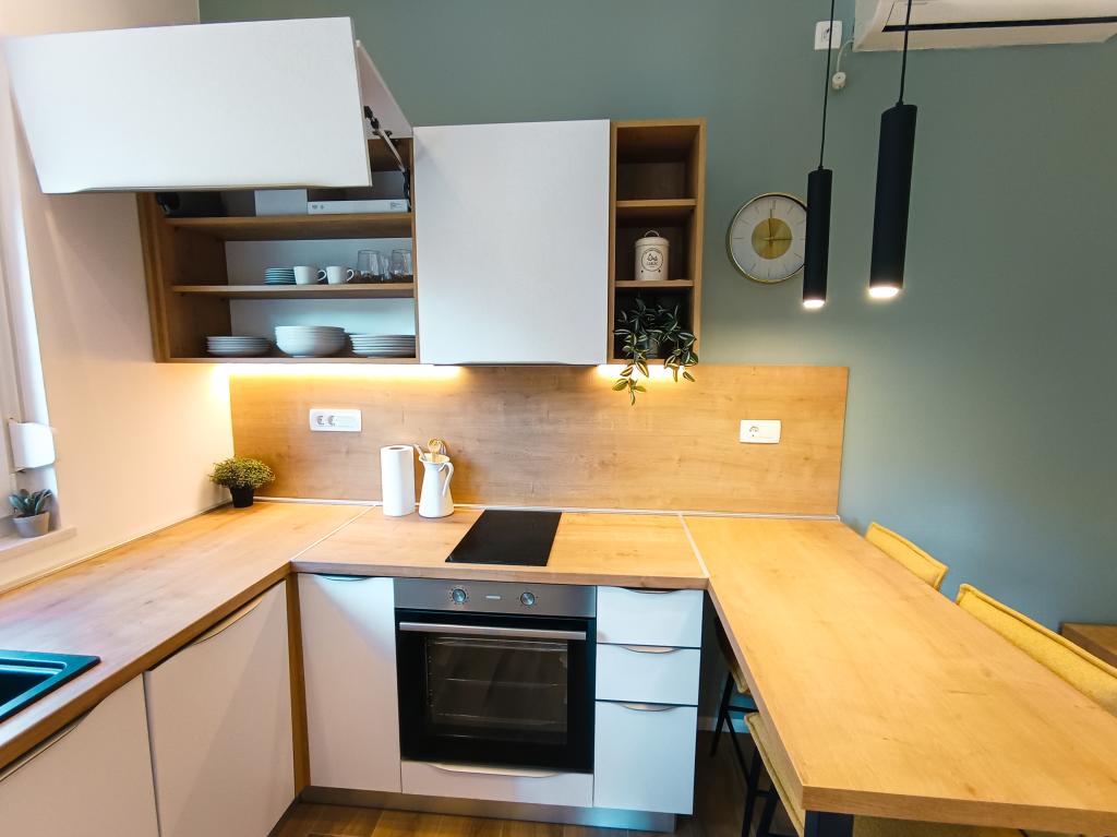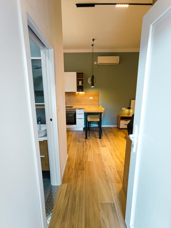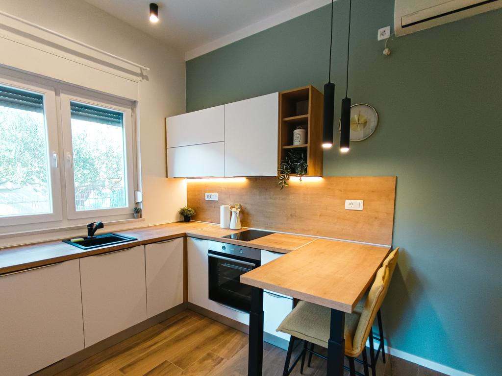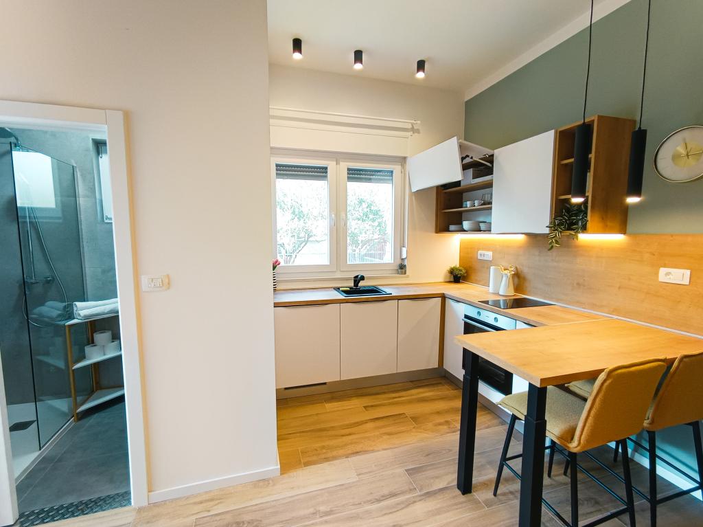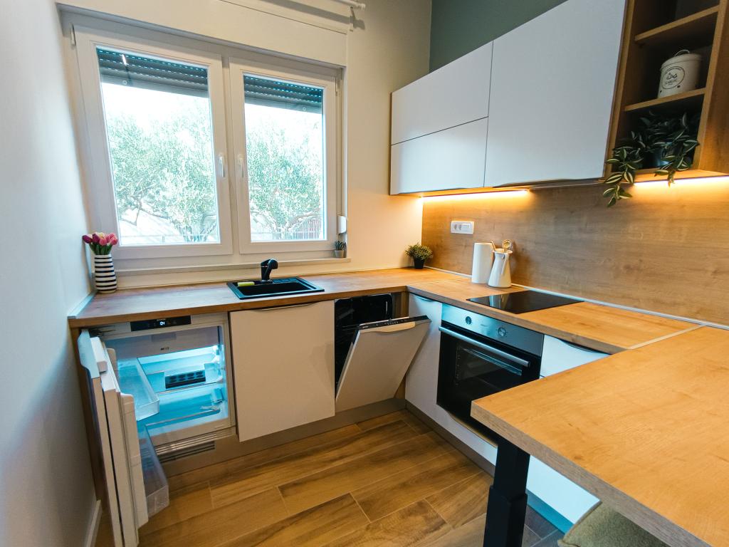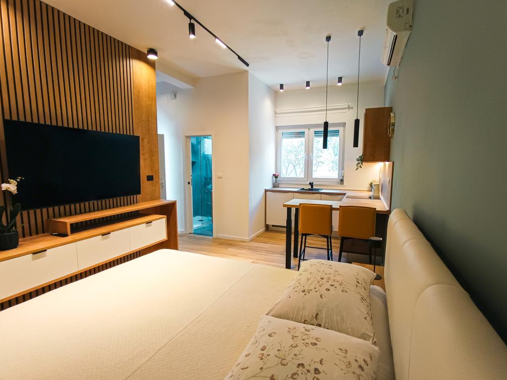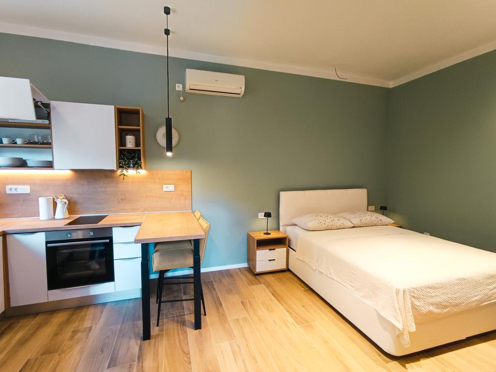 Popolnoma in moderno opremljen studio apartma v mirnem in družinskem okolju. Primeren za pare ali družino z enim otrokom. Studio apartma je klimatiziran in ima vse aparate in udobje, potrebne za brezskrben oddih v Zadru. Od elektronskih naprav še posebej izpostavljamo velik televizor, pomivalni stroj, pralni stroj in vgradni hladilnik z zamrzovalnikom. Studio vsebuje vse potrebne kuhinjske pripomočke in osnovne začimbe. Po dogovoru lahko dodamo otroško posteljico, otroški stolček ali dodatno ležišče. Studio apartma ima zasebno parkirišče, za tiste, ki radi hodijo, pa je središče mesta oddaljeno približno 20 minut hoje. V bližini se nahaja športno-rekreacijski center Višnjik, ki je idealen za vse, ki radi telovadijo na prostem, ima pa tudi veliko otroško igrišče.