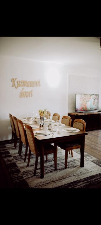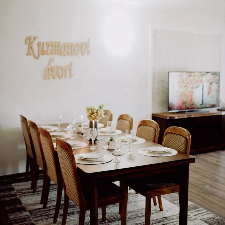 Uživajte v stoletni lepoti, počitniški hiši "Kuzmanovi dvori". Ta šokantna vila je popolnoma prestala preizkus časa. Še vedno nerodno stoji in si odpenja kratke lase. Hiša je popolnoma adaptirana. Ohranila je prvotno zunanjo podobo. Notranjost je prilagojena potrebam sodobnega človeka. Dvorišča obsegajo dve spalnici, veliko dnevno sobo z jedilnico, kuhinjo in kopalnico ter predsobo in veliko teraso s pogledom na urejeno dvorišče z originalno arhitekturo. Hišo krasi nekaj originalnih kosov pohištva iz družinske dediščine ter unikatni, masivni in ročno izdelani elementi. Prostorna dnevna soba z jedilnico vam omogoča sprostitev ob velikem Android TV-ju. Čarobnost ognja v kaminu in knjige v rokah zveni kot pravi dopust. Moderna in funkcionalna kuhinja (hladilnik, zamrzovalnik, štedilnik, kuhalnik vode, kavni avtomat), prostorna kopalnica s kadjo in pralnim strojem. Hiša je pokrita z neomejenim Wi-Fi omrežjem, kabelsko televizijo pa imamo na vseh treh televizorjih v hiši. Pridite k nam v Štitar in doživite Slavonijo, Šokadijo v vsem njenem sijaju in v vsem udobju, ki ga potrebujete za vaš dopust.