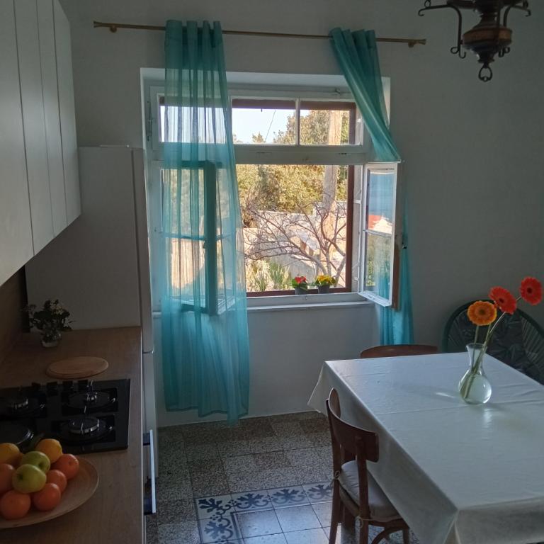 Počitniška hiša Lena se nahaja na začetku ceste proti Sveti Jeleni, na vrhu otoka, kjer se nahaja stara vas, 5 minut hoje od lokalne plaže in centra mesta.Hiša nudi udobno bivanje za 6 ljudi.Velika terasa, ki jemlje dih, ponuja panoramski pogled na Rivanski kanal in bližnje otoke.Velik vrt in vrt v velikosti 1500m2 zagotavljata idealno okolje za druženje in sprostitev.Zagotovljeno je parkirišče. Dobrodošli v kraj za sprostitev, stran od vročega mestnega asfalta, kjer imate edinstveno priložnost, da vam sonce, čisto morje in zvezdnato nebo dajo vso svojo rodovitno notranjost.