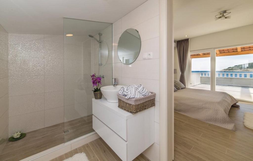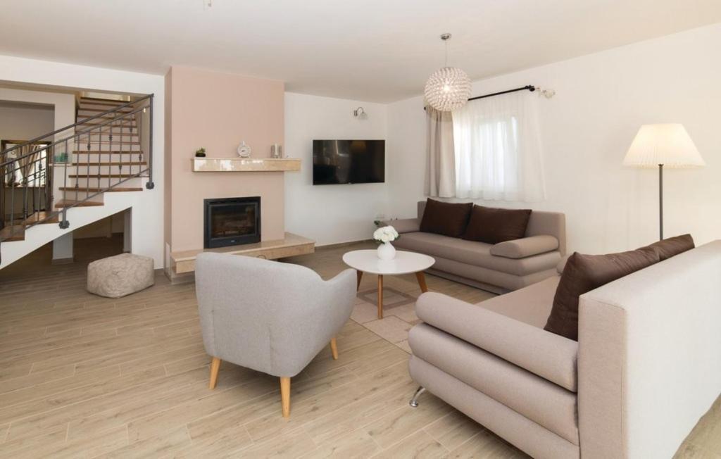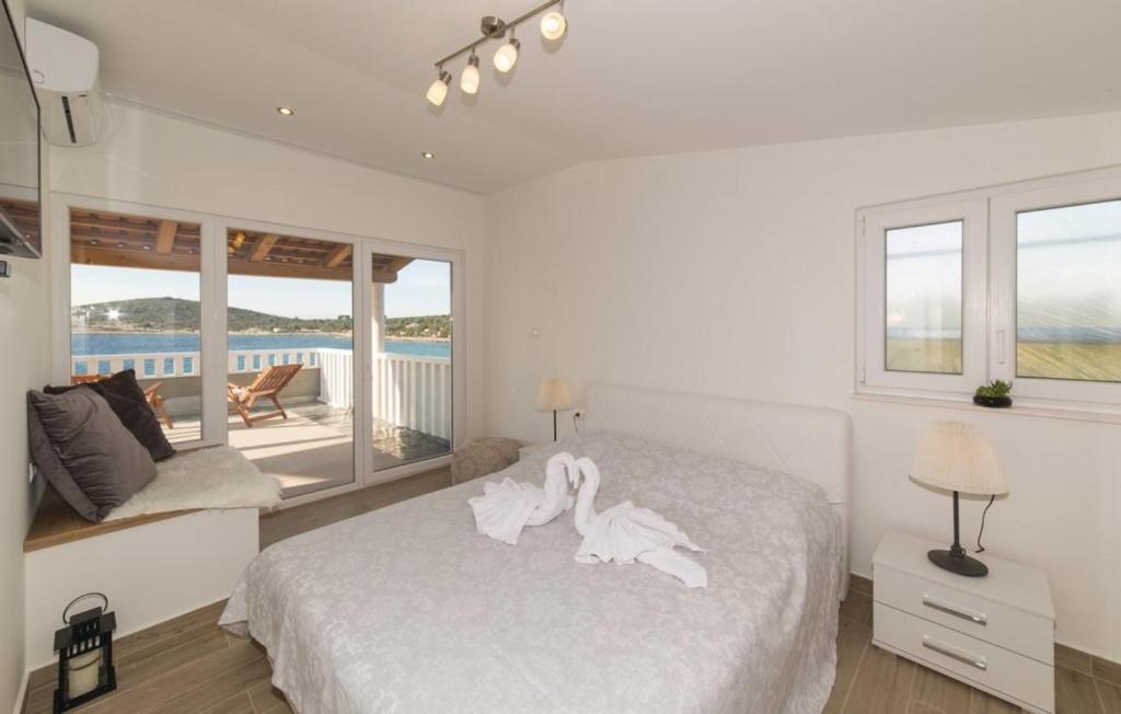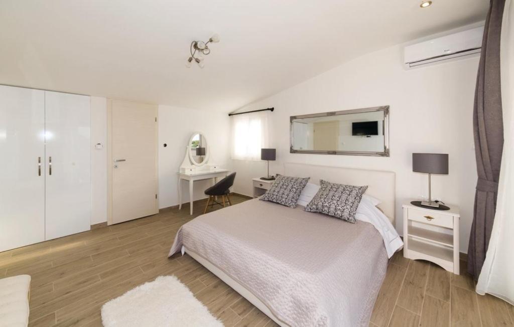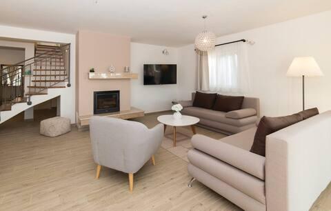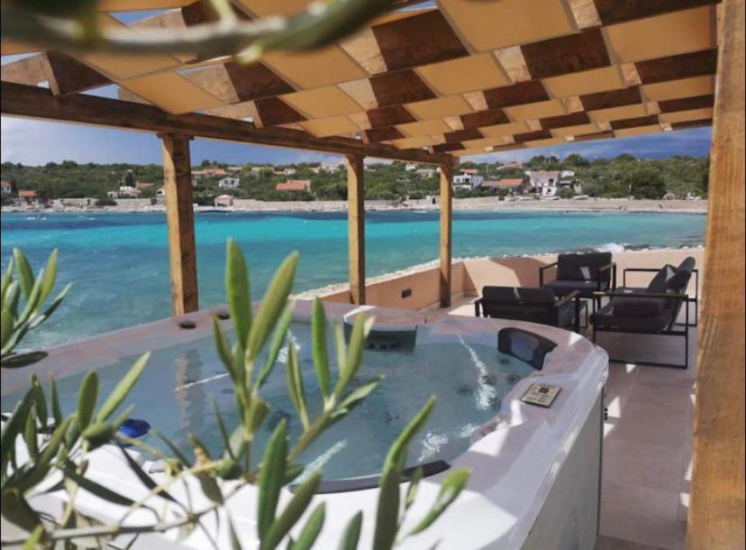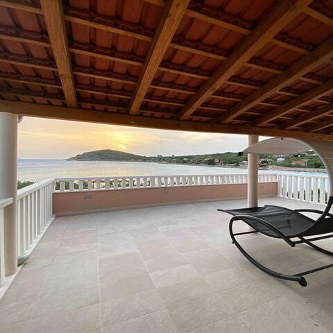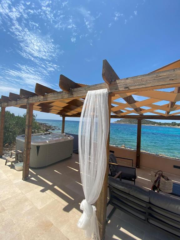 Prostorna luksuzna hiša 250 m2 na obali, na zemljišču 2000 m2, prva vrsta do morja, s 4 spalnicami in 4 kopalnicami, veliko kuhinjo in dnevno sobo, zunanjim kaminom in zunanjo jedilnico. Na parceli, tik ob morju, se nahaja jacuzzi, ležalniki za sončenje, zunanji ogrevani tuš. Peščena plaža je oddaljena le 50 m in sprejme 10 odraslih oseb z možnostjo 2 manjših otrok. Hiša je idealna za družine, zaradi bližine plaže za pešce in vseh dodatnih vsebin. Zasebnost je zagotovljena.