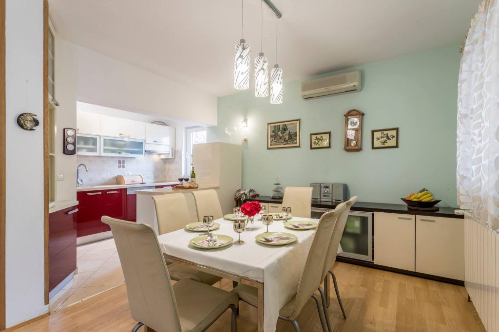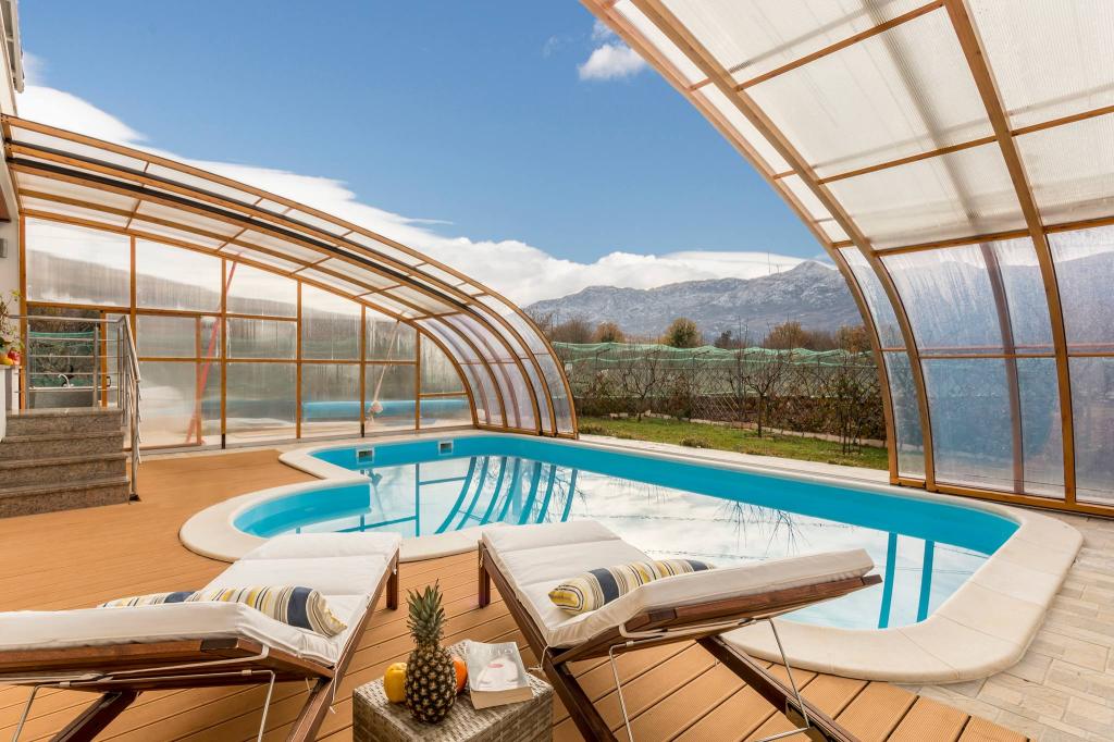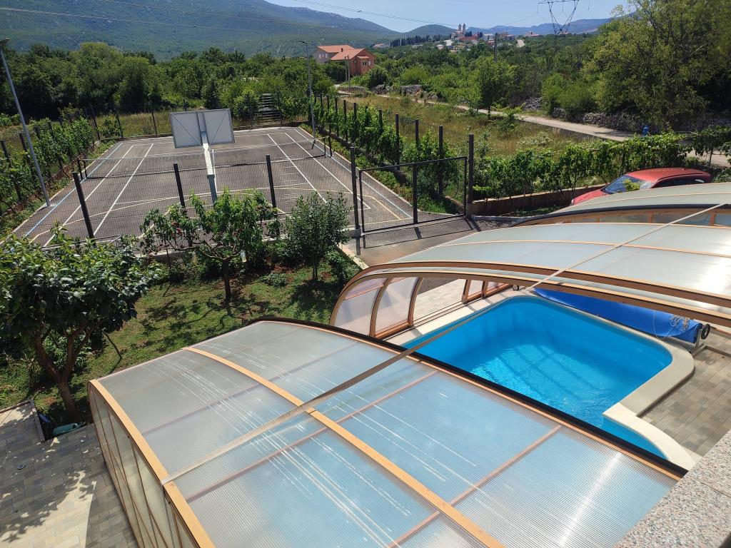 Uživajte mirne počitnice v prostorni hiši v Dugopolju, idealni za družine, pare ali skupine prijateljev. Nepremičnina ponuja zasebni bazen, veliko teniško igrišče s košarkarskim košem in edinstven razgled na gore, ki ustvarja popolno vzdušje za sprostitev. Hiša je popolnoma opremljena za prijetno bivanje: moderna kuhinja, udobna dnevna soba, klimatizirane spalnice in prostorno dvorišče, ki vabi k druženju.
