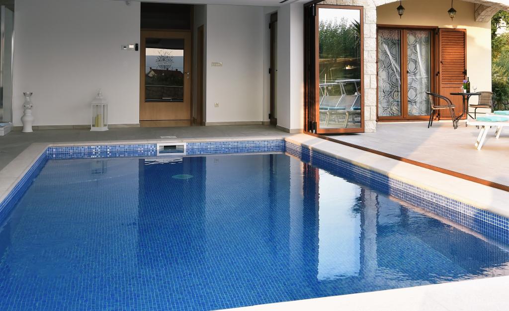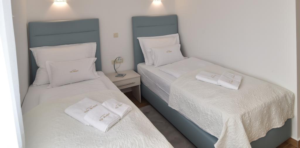 Novozgrajena Vila Muškatel ima možnost ogrevanja in hlajenja. Ogrevan bazen velikosti 21 m2 se nahaja na popolnoma mirni lokaciji obdan z oljčnim vrtom, 10 minut od centra, 15 minut od morja in 10 minut od trgovine. Na voljo so 4 sobe, vsaka s kopalnico, TV, WI FI, balkonom. Popolnoma opremljena kuhinja s hladilnikom, vinskim barom, pomivalnim strojem, mikrovalovno pečico, pečico, aparati za kavo. V pritličju se nahaja jedilnica in dnevna soba s TV, WI FI V kleti je biljard, namizni nogomet, orbitrek, WC ter pralni in sušilni stroj. Ob bazenu je terasa z ležalniki. Vila ima zunanji žar z mizo in stoli ter namizni tenis. Vila ima tudi pokrito brezplačno parkirišče. Ob parkirišču je shramba za 8 koles.