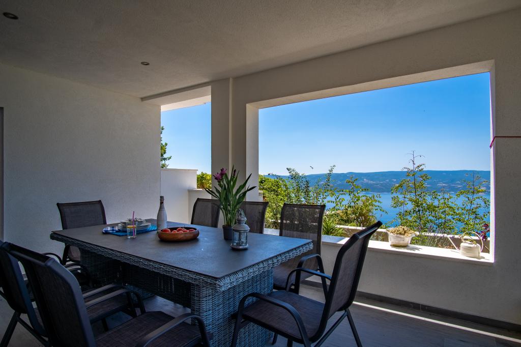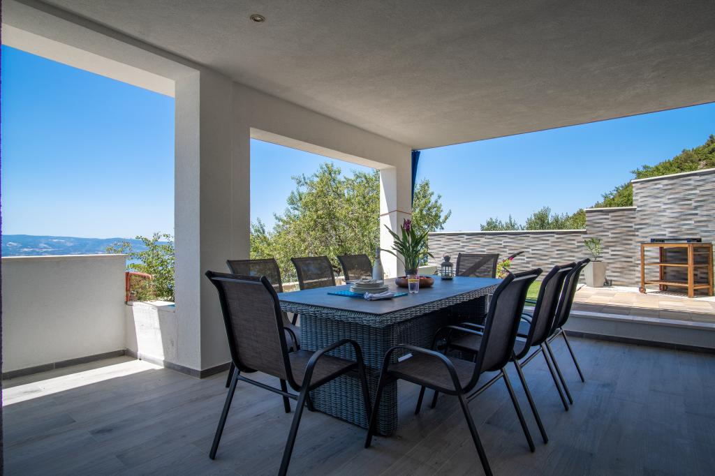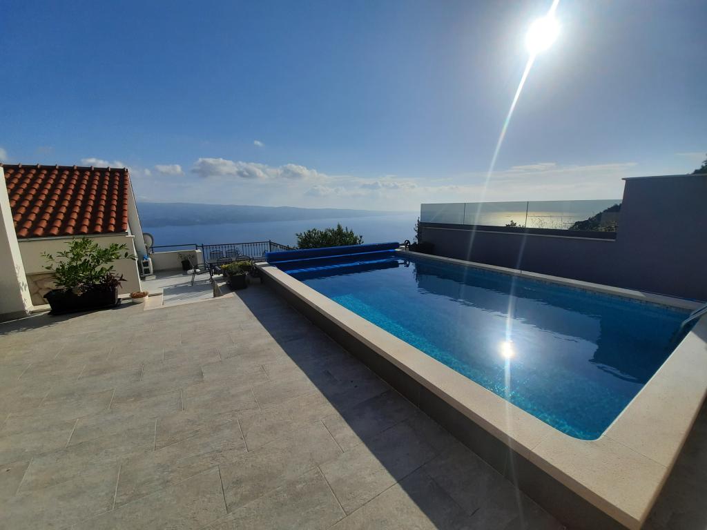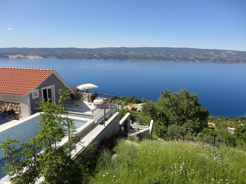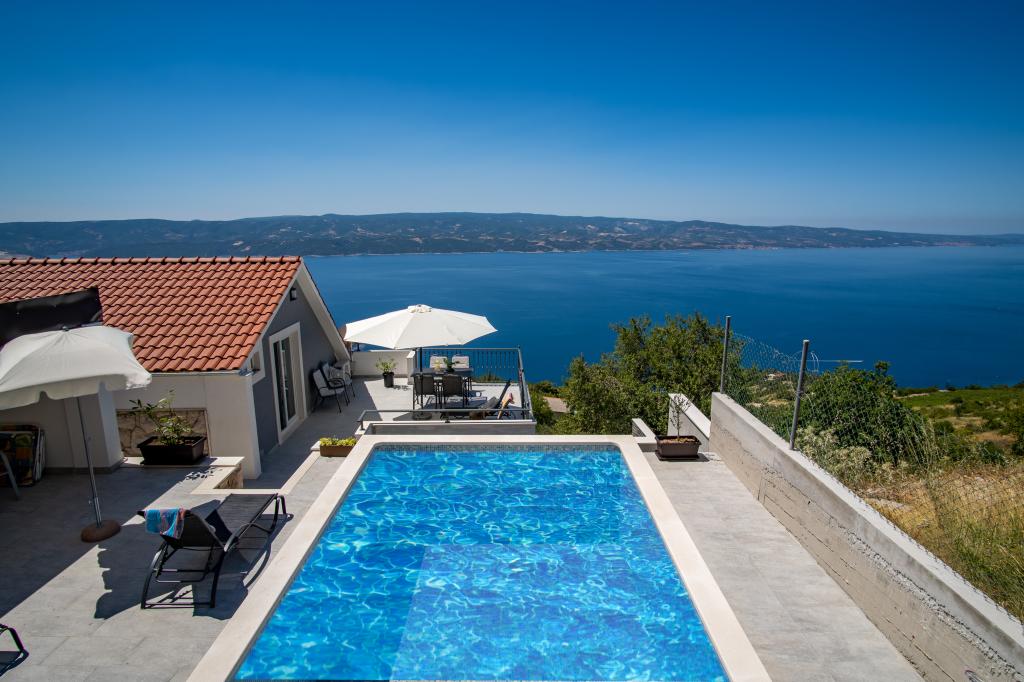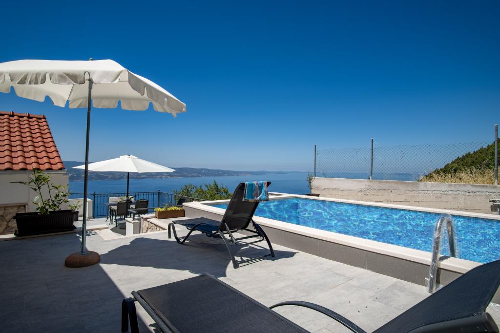 Nova popolnoma opremljena vila z ogrevanim bazenom. s fantastičnim pogledom na Makarsko riviero, otok Brač in Splitski arhipelag, skoraj 200 kilometrov širok razgled. Vila se nahaja 300 m nadmorske višine in se nahaja ob vznožju gore Omiška Dinara 600 m nadmorske višine in 100 0m od morja. Hrib je priljubljeno izletniško mesto številnih turistov. Ceste so označene in na hribu sta 2 planinski hiši za obiskovalce in izvirsko vodo. Vila ima 3 spalnice z zakonsko posteljo, 3 kopalnice, manjšo sobo s kavčem in TV, veliko teraso za sončenje, bazen s teraso, veliko pokrito teraso z vrtno garnituro, zeleno sončno teraso, parkirišče za 2+2 vozila. Nahaja se 5 km od čudovitega mesta Omiš. Vse spalnice imajo pogled na morje. Kuhinja je popolnoma opremljena in nudi vse, kar potrebujete. Vila je obdana z oljčnimi nasadi in vinogradi. Naši gostje bodo lahko posadili eno oljko v našem oljčniku. Naši prijatelji pravijo, da ima ta vila dušo in telo.