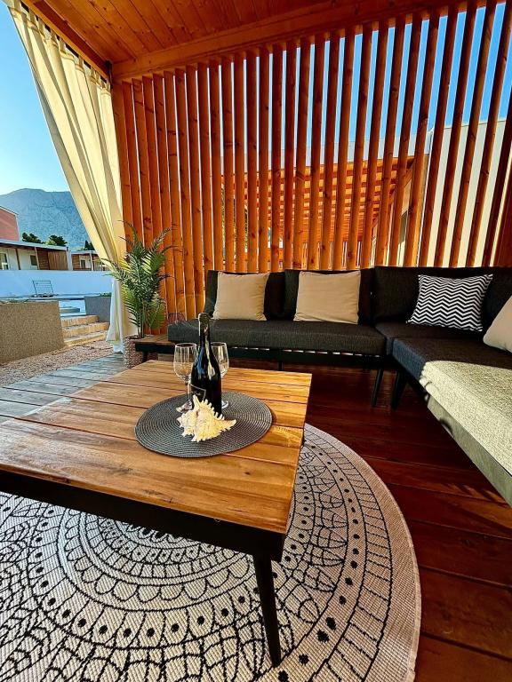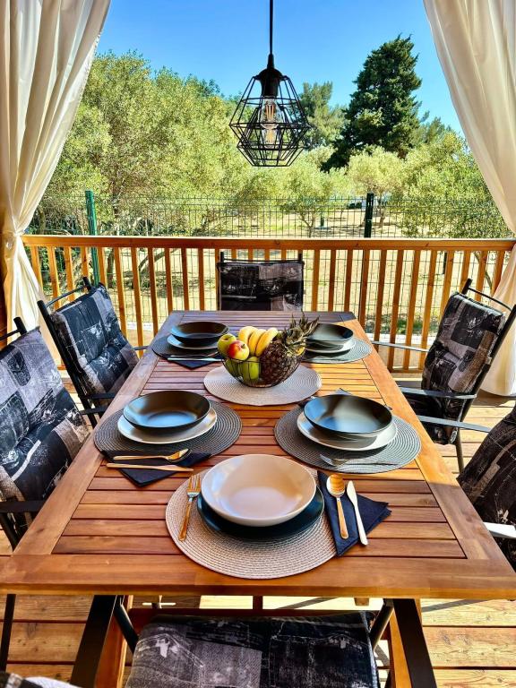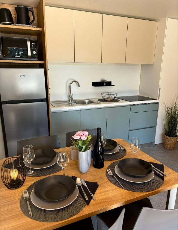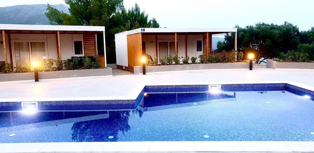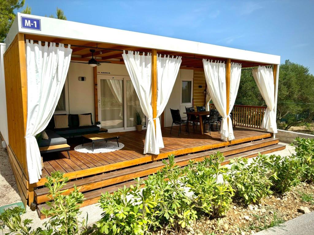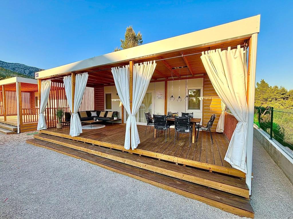 Odkrijte novo moderno mobilno hišico v mediteranskem slogu, ki se nahaja v majhnem dalmatinskem mestecu Orebić (kamp »Dalmata«), obdano z neokrnjeno naravo in zlatimi plažami, z različnimi restavracijami in vinarnicami z vrhunsko kulinariko in znanimi vini. Sprostite se na 30 m2 veliki terasi, le nekaj korakov od bazena, opremljeni z ležalniki, zunanjim prostorom za sedenje in vsem, kar potrebujete za zadovoljitev svojih hedonističnih želja.