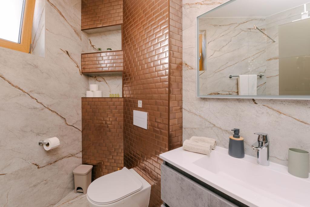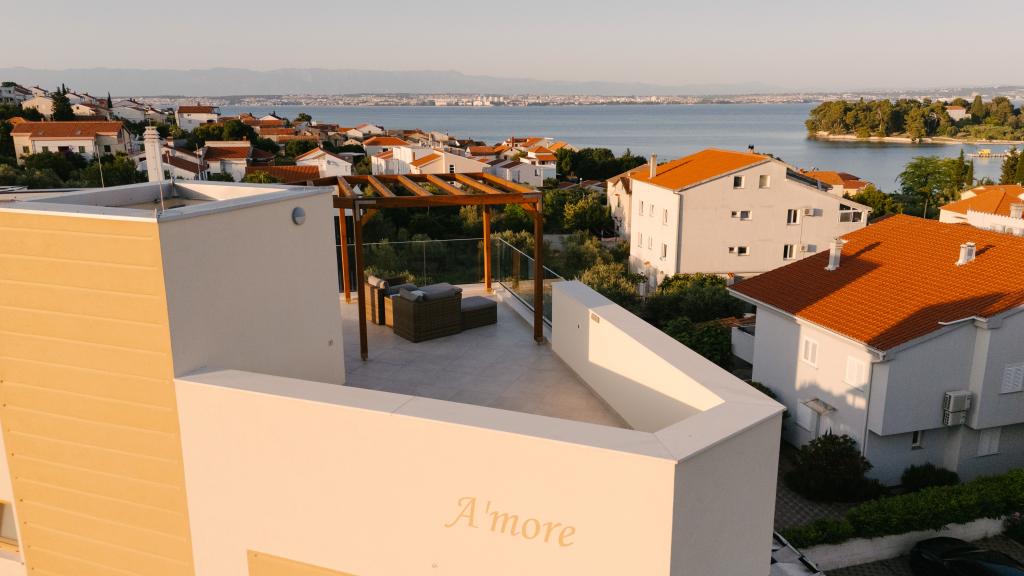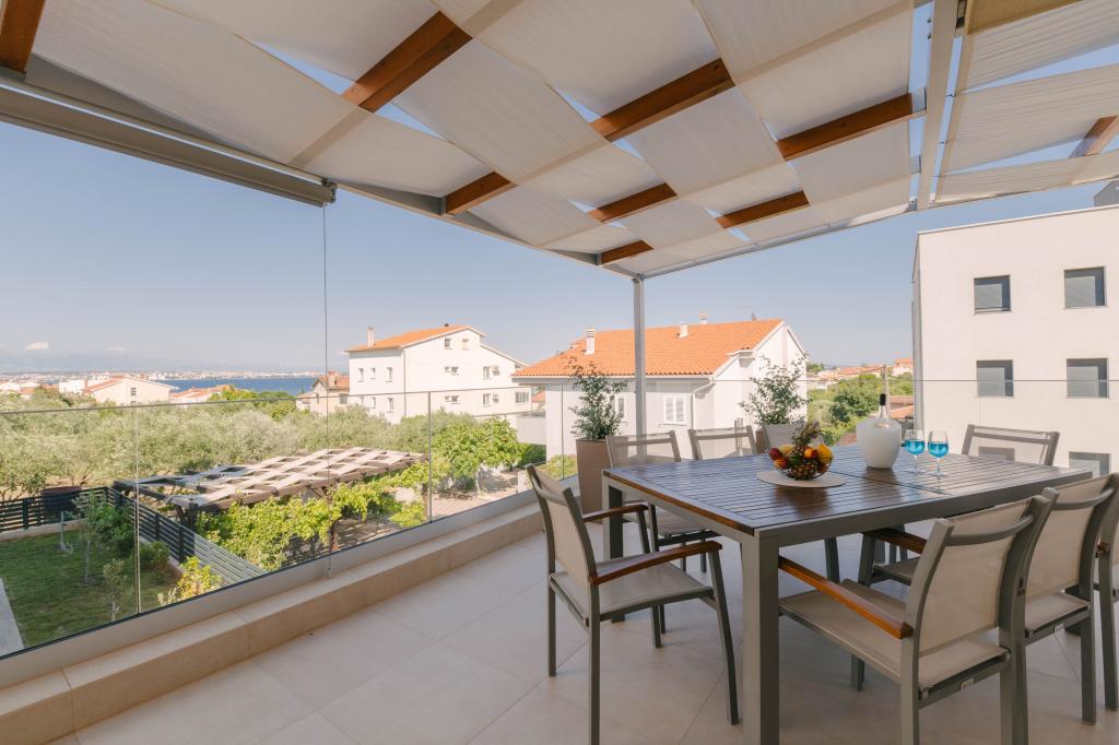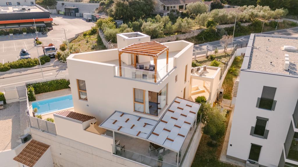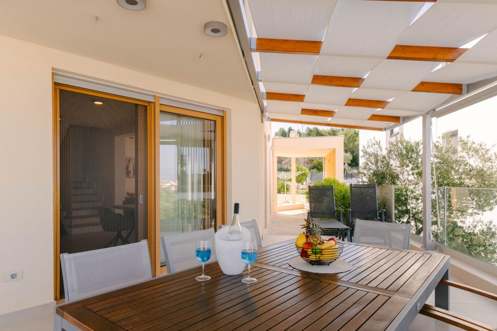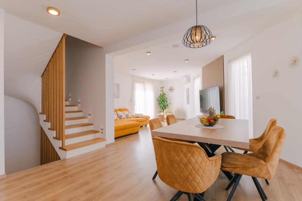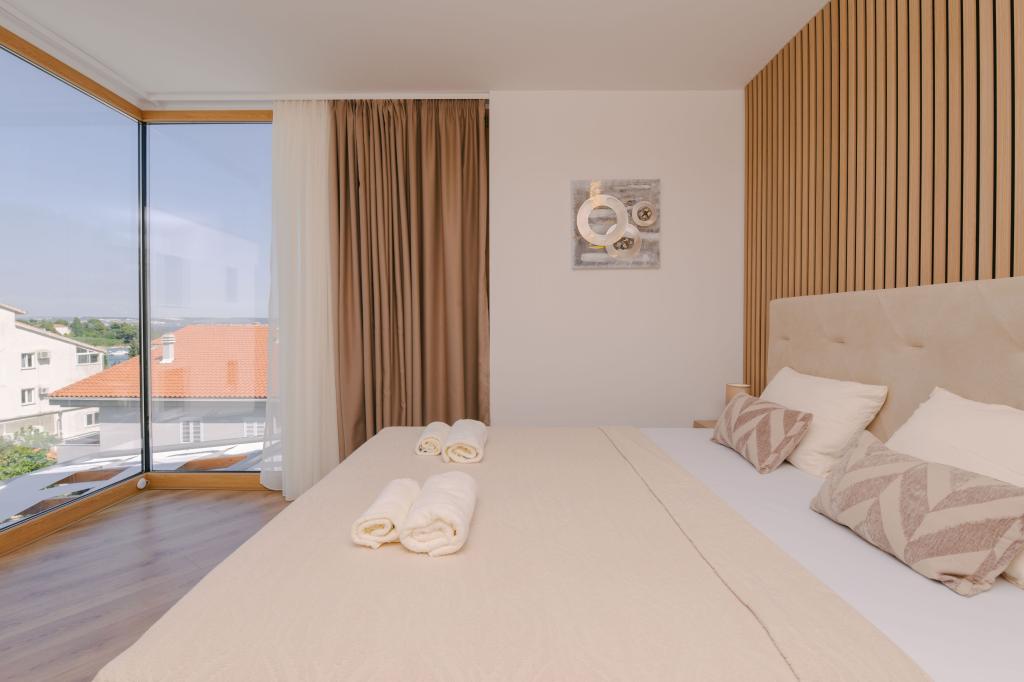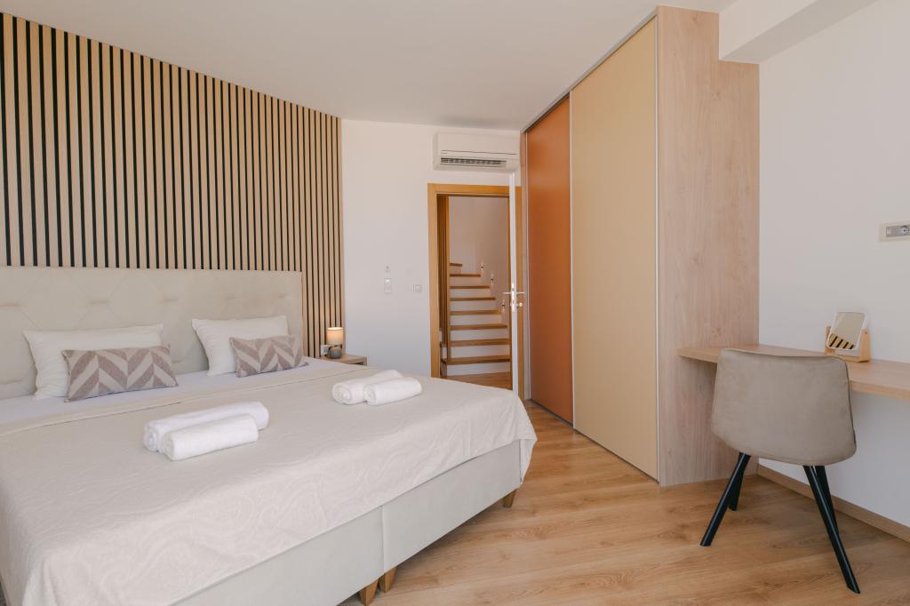 Tri moderne glavne spalnice se nahajajo v zgornjem nadstropju, ena soba za goste pa v kleti. Vse kopalnice so opremljene z vrhunskimi armaturami Grohe in Laufen, prestižnimi dizajnerskimi keramičnimi ploščicami in elegantnimi steklenimi vrati. Hiša je uradno kategorizirana s strani Ministrstva za turizem Republike Hrvaške, kar omogoča udobno namestitev za 9, celo 10 gostov. Dnevna soba in jedilnica odprtega tipa ter vsaka spalnica so opremljene z individualnimi klimatskimi napravami s tihim načinom, kar je idealno za miren spanec. Moderna kuhinja znane avstrijske blagovne znamke DanKüchen je v celoti opremljena z vrhunskimi aparati, vključno s hladilnikom z ledomatom in dozatorjem hladne vode.
