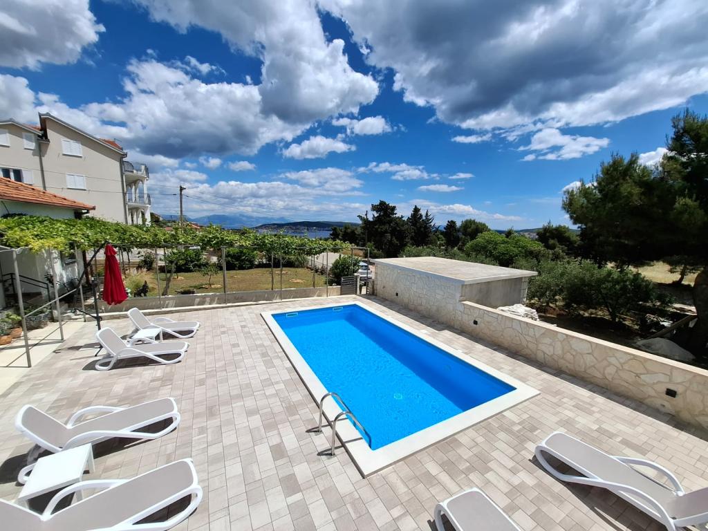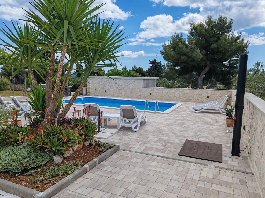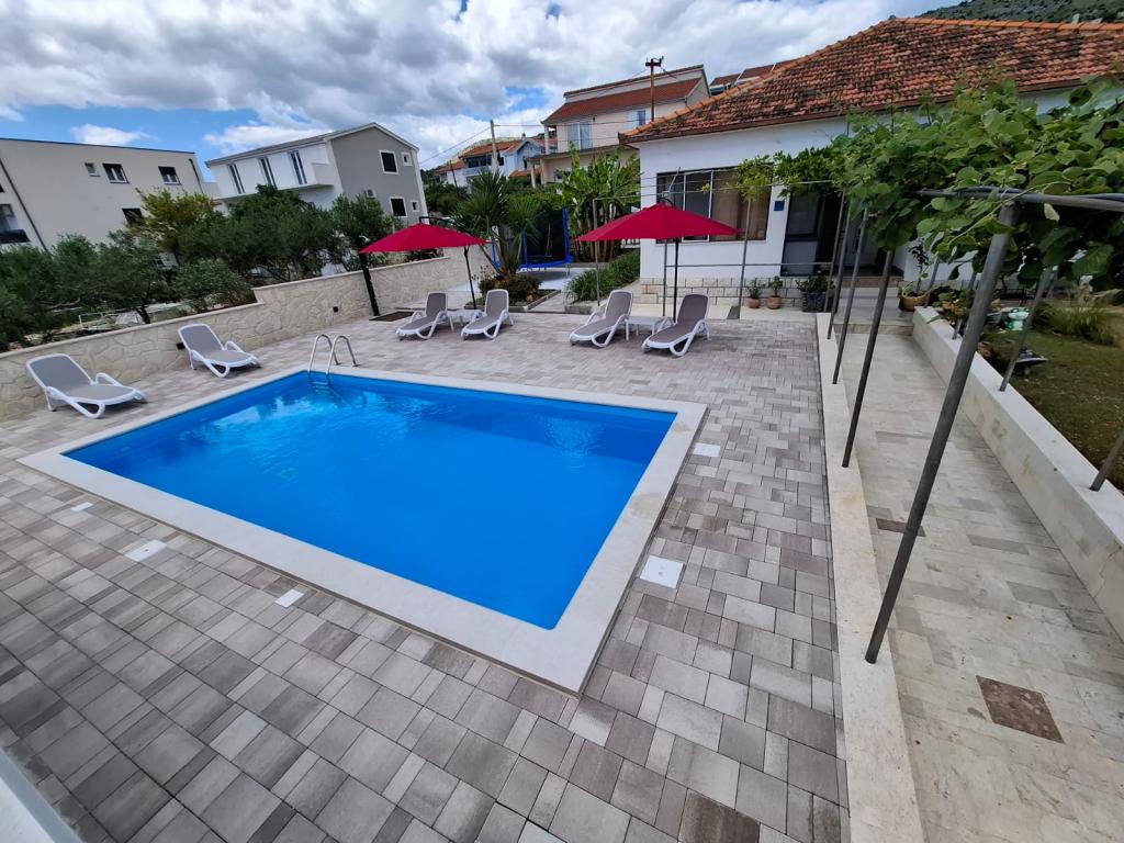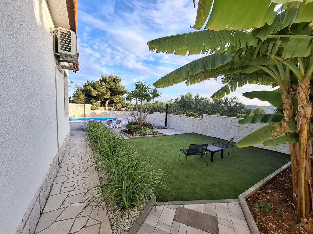 Ta na novo prenovljena družinska hiša, primerna za 7 oseb, se nahaja v bližini Trogirja, v okrožju Seget Donji, v bližini hotela Medena. Hiša se nahaja na 700 m2 veliki parceli in ima 150 m2 bivalne površine. Zunanja kuhinja z mizo za 8 oseb, zunanji WC, velik žar in zasebni bazen vam nudijo vse, kar potrebujete za prijeten in sproščujoč oddih. Celoten prostor je moderno opremljen, klimatiziran in ima brezžični internet. Notranja kuhinja je popolnoma opremljena in vsebuje vse gospodinjske aparate. Hiša ima 3 moderno opremljene, velike spalnice. Vsaka spalnica ima satelitsko televizijo in klimatsko napravo. Večja kopalnica ima kad in pralni stroj. Manjša kopalnica ima tuš kabino. V hiši je tudi majhna telovadnica. Pred hišo je parkirišče za 3 avtomobile. Velika veranda z vrtom vam bo nudila mir in sprostitev, zunanja kuhinja pa je prostor za druženje z družino in prijatelji. Gostom je na voljo celotna hiša in vrt z bazenom.