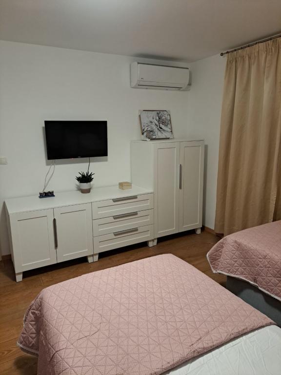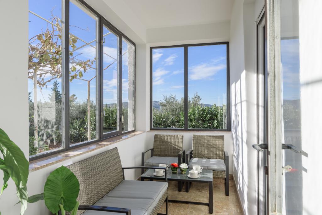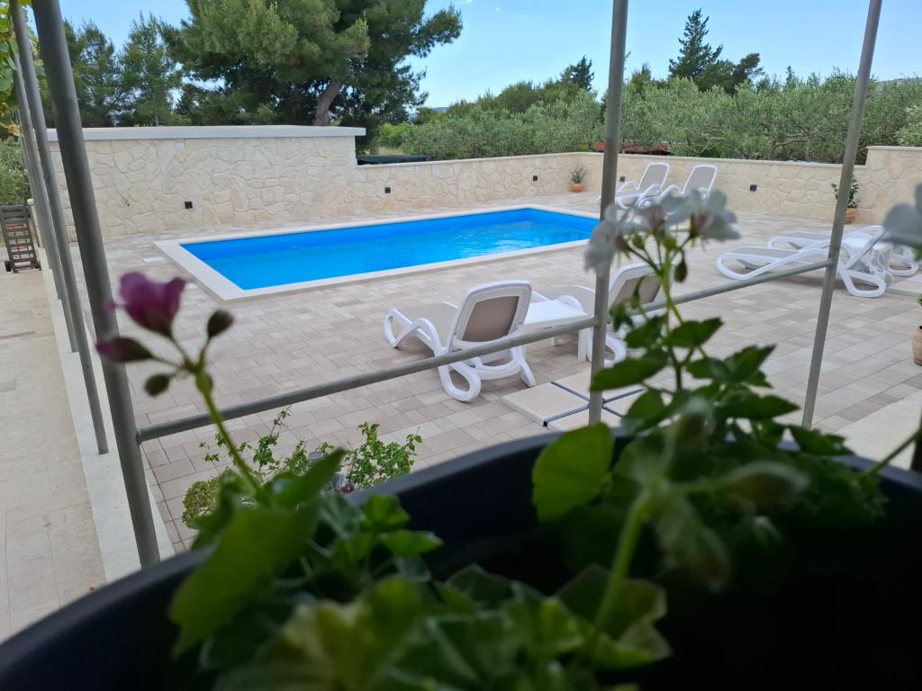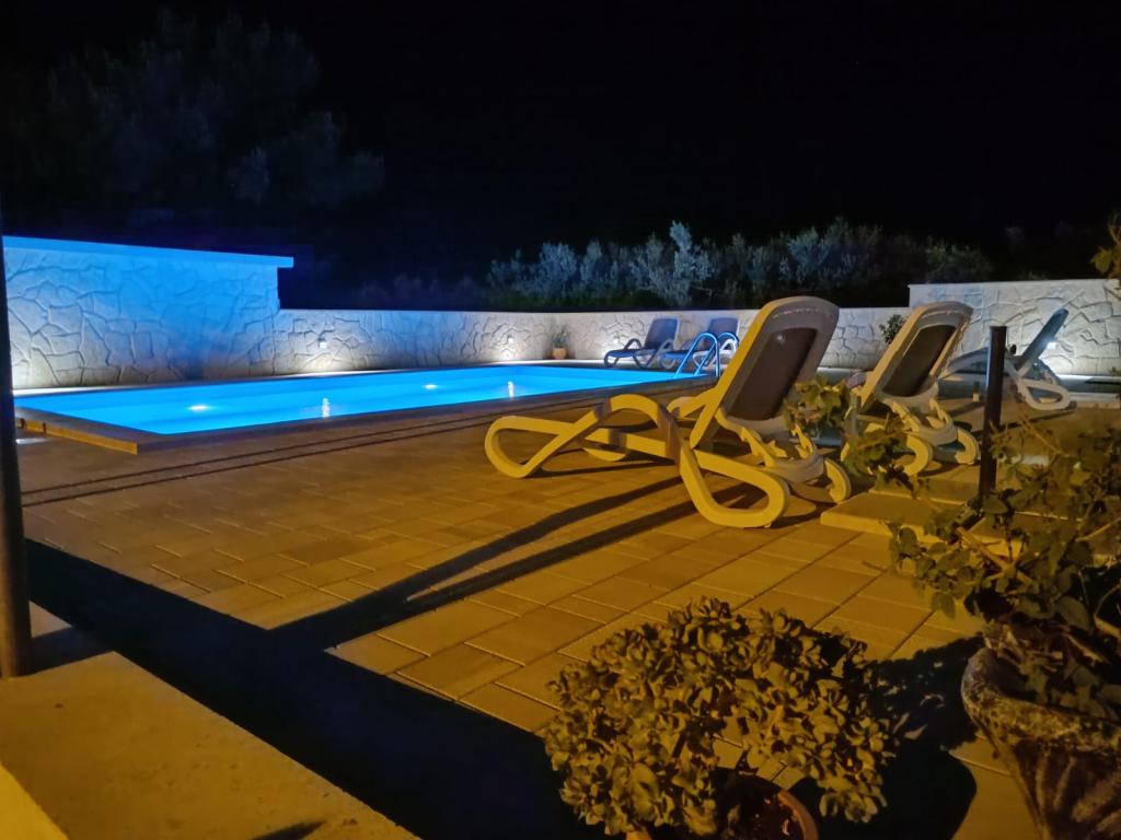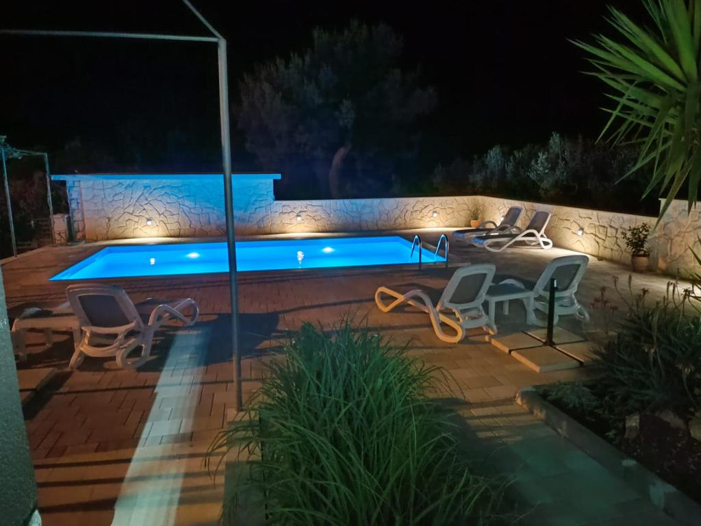 Ta na novo prenovljena družinska hiša, primerna za 7 oseb, se nahaja v bližini Trogirja, v okrožju Seget Donji, v bližini hotela Medena. Hiša se nahaja na 700 m2 veliki parceli in ima 150 m2 bivalne površine. Zunanja kuhinja z mizo za 8 oseb, zunanji WC, velik žar in zasebni bazen vam nudijo vse, kar potrebujete za prijeten in sproščujoč oddih. Celoten prostor je moderno opremljen, klimatiziran in ima brezžični internet. Notranja kuhinja je popolnoma opremljena in vsebuje vse gospodinjske aparate. Hiša ima 3 moderno opremljene, velike spalnice. Vsaka spalnica ima satelitsko televizijo in klimatsko napravo. Večja kopalnica ima kad in pralni stroj. Manjša kopalnica ima tuš kabino. V hiši je tudi majhna telovadnica. Pred hišo je parkirišče za 3 avtomobile. Velika veranda z vrtom vam bo nudila mir in sprostitev, zunanja kuhinja pa je prostor za druženje z družino in prijatelji. Gostom je na voljo celotna hiša in vrt z bazenom.