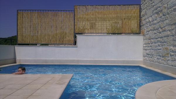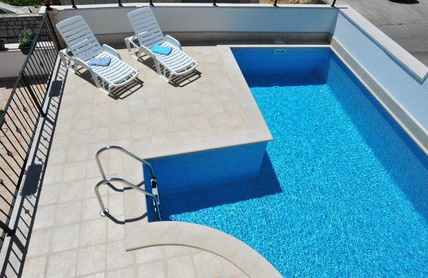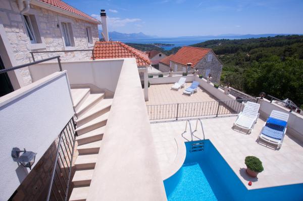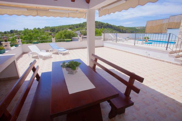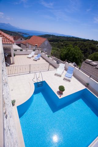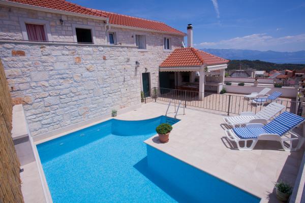 Udobna in na novo urejena počitniška hiša (4) v Selcah na otoku Braču. Hiša ima 2 nadstropja, v prvem nadstropju sta 2 spalnici, 2 kopalnici, kuhinja z jedilnico in dnevna soba. V pritličju sta 2 spalnici z zakonsko posteljo, 2 kopalnici in prostor za počitek (lcd tv, dvd, dobro počutje, oprema za vadbo). Hiša ima prostorno teraso 100m2, GRANULARNI KAT 18m2 opremljen z računalniško tehnologijo za merjenje pH vode in doziranje klora, pokrit del z žarom in vrtno pohištvo. Hiša ima tudi 2 parkirna mesta, tj. Zaprto garažo in pokrito garažno mesto