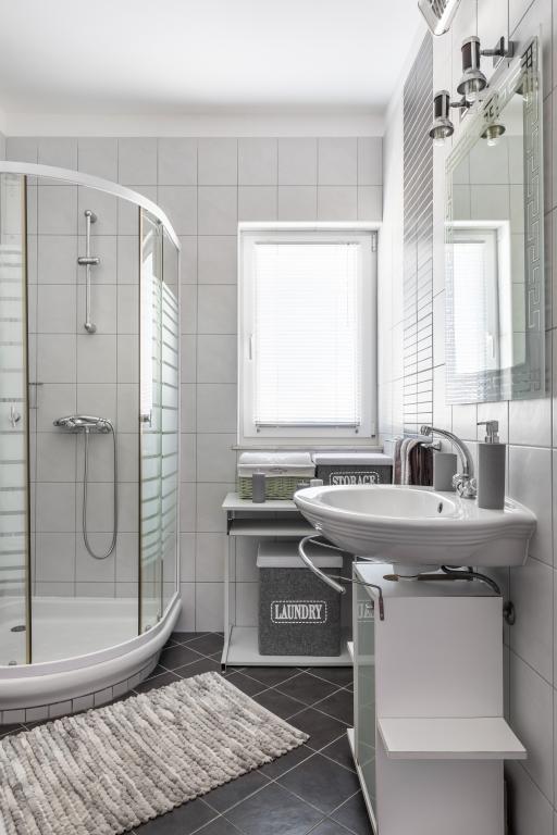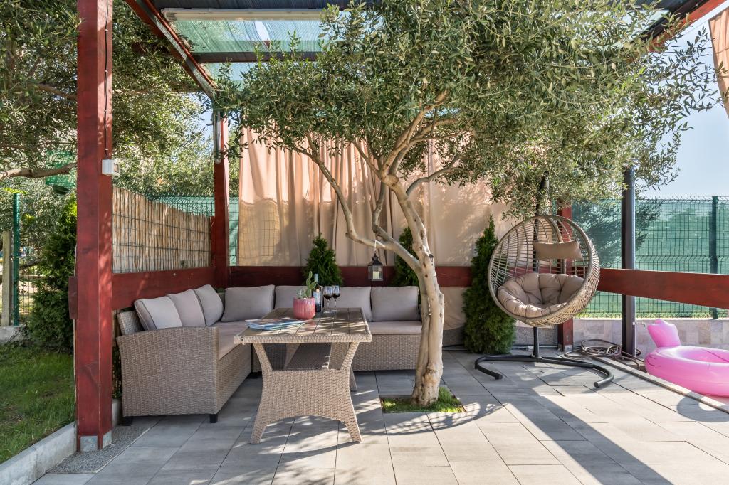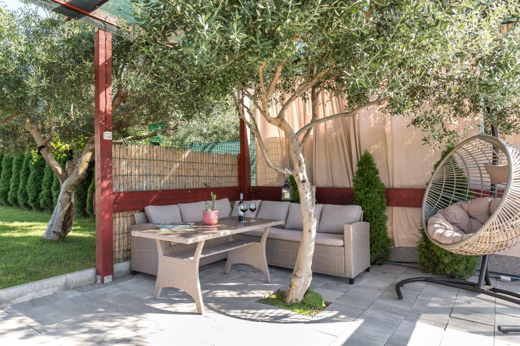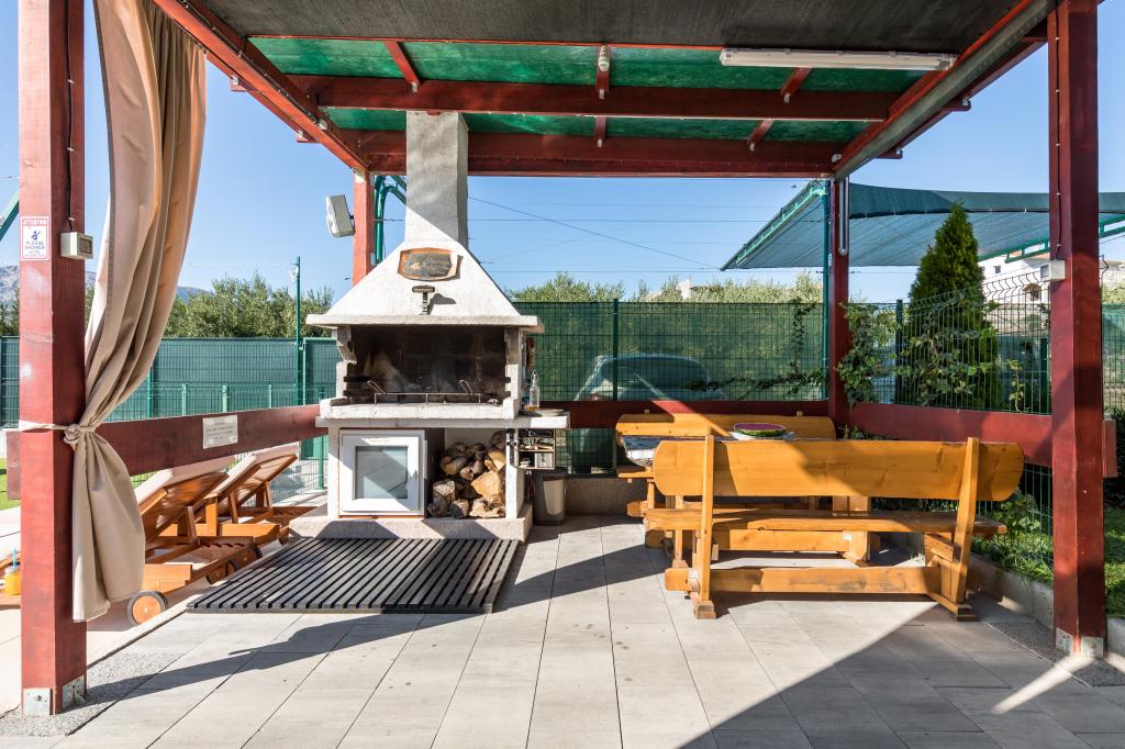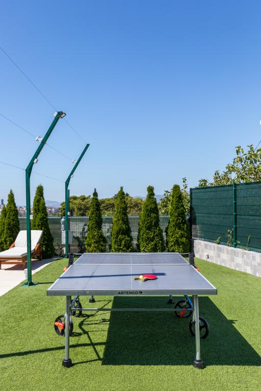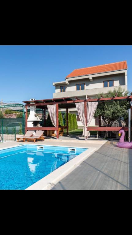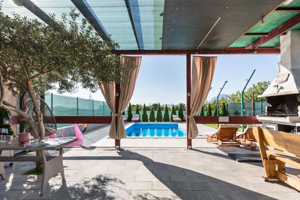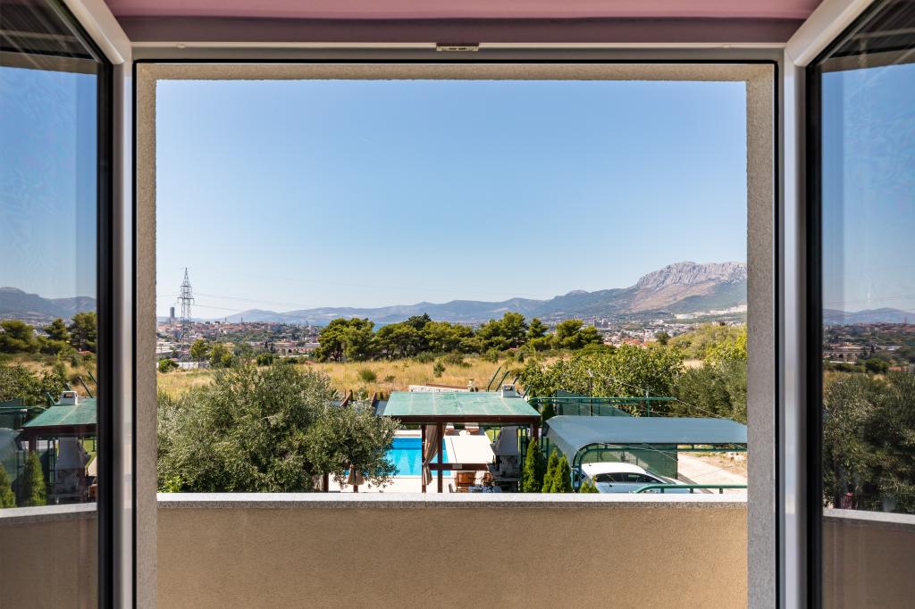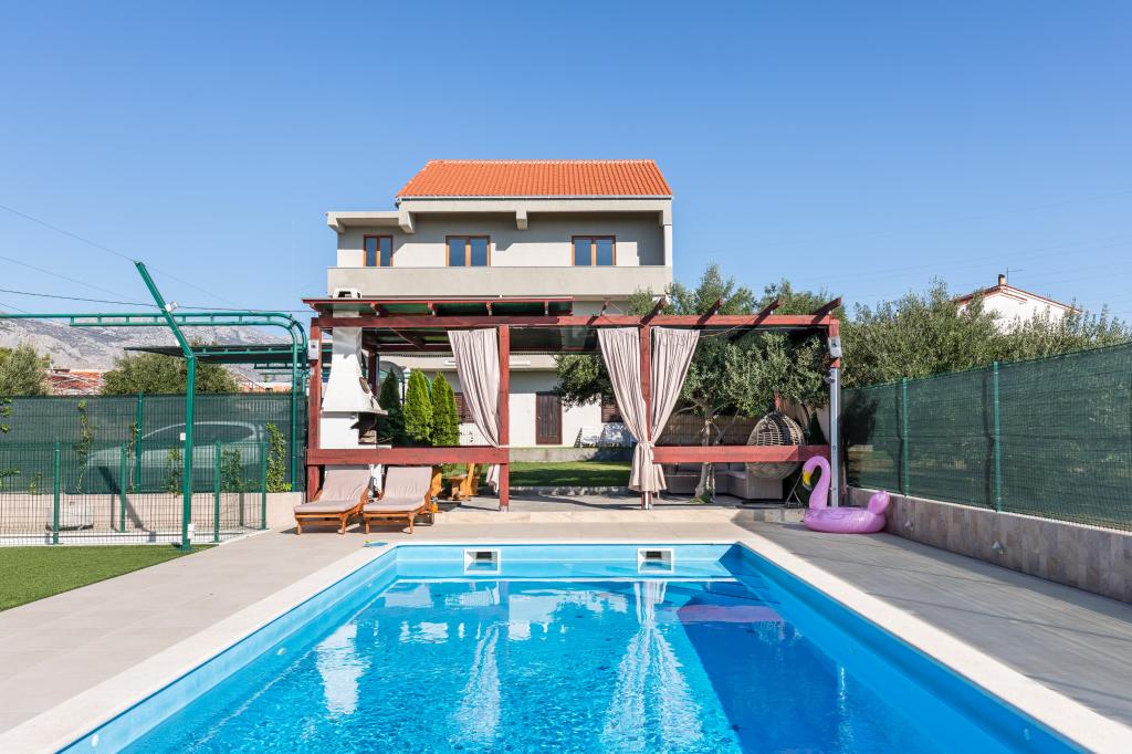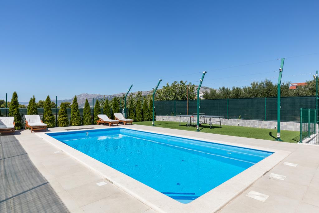 Vila z bazenom 8x4 m, vrt 180 m², telovadnica s fliperjem in video igricami, zasebno parkirišče za 5 avtomobilov, prostor ob bazenu za namizni tenis na mehki umetni travi, klet 50 kvadratnih metrov za nočne zabave z biljardom in veliko TV od 75 palcev, kjer lahko gledate netflix ali poslušate glasbo prek ojačevalcev in poljubno brskate po brezžičnem internetu. Vila ima tri ločene apartmaje z vso opremo.Med vrtom in bazenom je velik gazebo 8x4m za peko na žaru in počitek.celoten prostor,tj cela vila je namenjena samo gostom in je idealno mesto kjer lahko sprostite se in se zabavajte v naravnem oljčnem nasadu s pogledom na cel Split, Kaštela, hrib Kozijak ali planino Mosor.V bližini je več velikih nakupovalnih centrov Hitro jih poiščite za vse vaše potrebe.