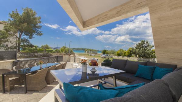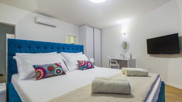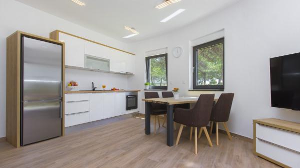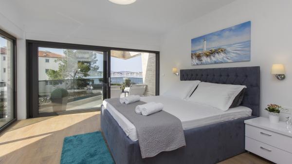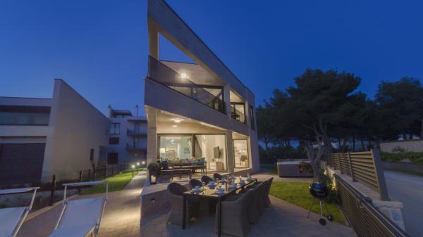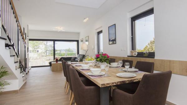 Villa Okit je na novo zgrajena in moderna vila, ki se nahaja le 50 m od peščene plaže v Srimi, 3 km od Vodic, 13 km od Šibenika. V pritličju je kuhinja, dnevna soba in dnevna soba, ki sestavljajo eno enoto in ločeno kopalnico, iz dnevne sobe je terasa in urejeno dvorišče z vrtno garnituro in prostorom za sončenje. Kuhinja je v celoti opremljena s potrebnimi pripomočki in kuhinjami za pripravo jedi in pijač. V pritličju je tudi ločen apartma z eno spalnico, kopalnico, kuhinjo in jedilnico, kjer lahko izstopite iz dvorišča. V 1. nadstropju hiše so 4 spalnice in 3 kopalnice. Spalnica 1, 20m2 z lastno kopalnico in izhodom na balkon, postelja 180X200, TV. Spalnica 2, 25m2, z lastno kopalnico in izhodom na balkon, postelja 180X200, TV. Spalnica 3 in Spoke 4 imata skupno kopalnico, vsaka po 15 m2, vsaka ima posteljo 180x200, komodo in TV. Ograjeno dvorišče s prostorom za sončenje in vrtno pohištvo, parkirno mesto.